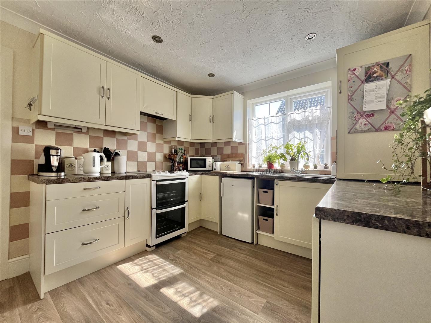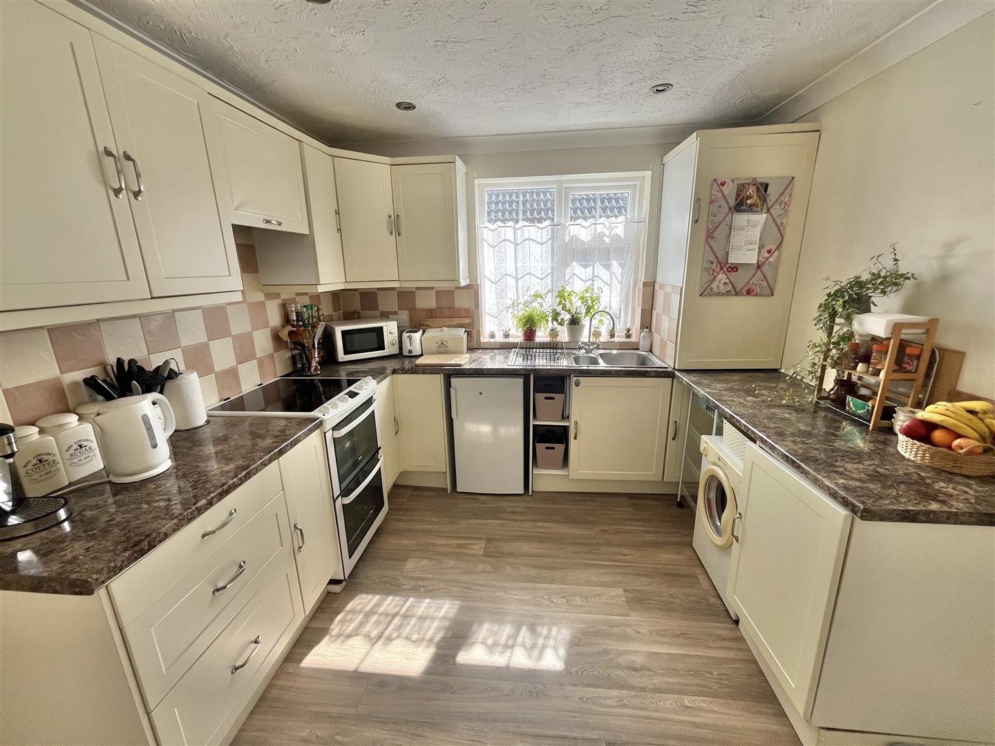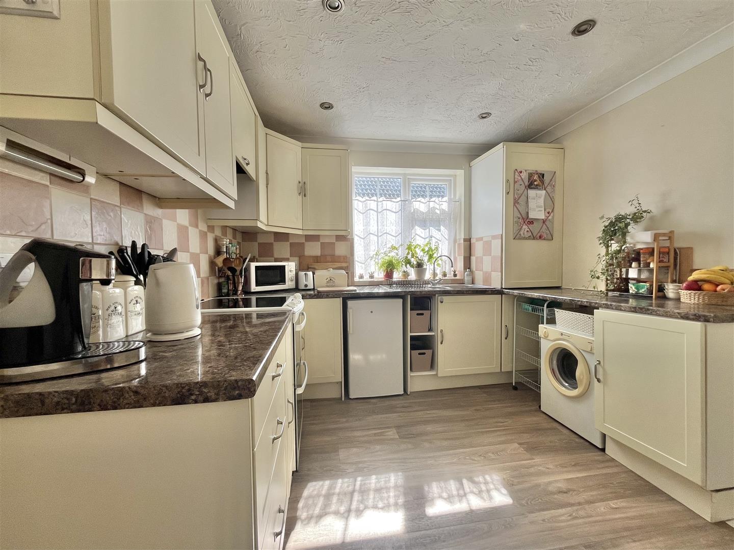 Granite effect rolled edge work surfaces with Beige wall mounted cabinets with cupboards and drawers below. Cupboard housing gas combination boiler. Inset one and a half bowl stainless steel sink unit with mixer tap. Space for fridge. Space for cooker. Space for dryer. Extractor hood. (All appliances not tested). Tiled splashbacks. Radiator. Double glazed window to side.