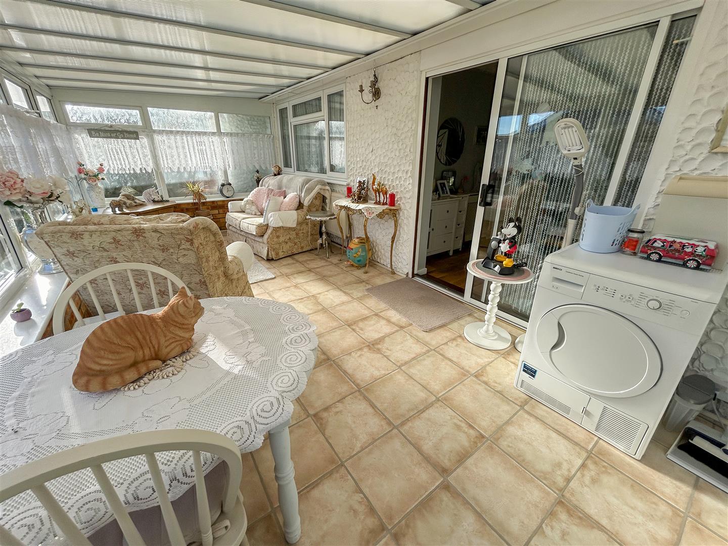 Wall mounted white gloss fronted units with square edge work surfaces with cupboards below. Space for double fridge/freezer. Sliding doors leading to conservatory.