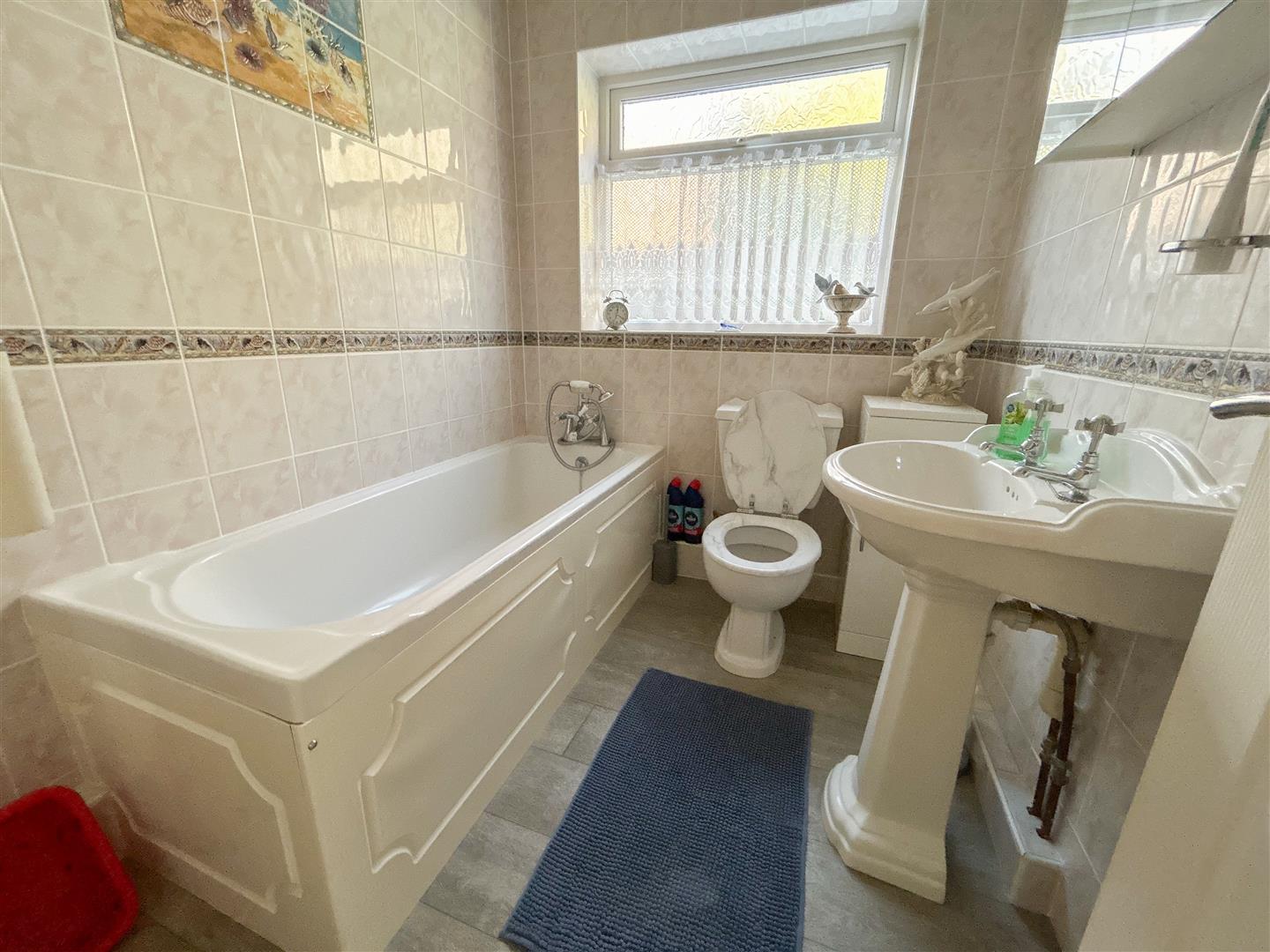 Low level W/C. Pedestal hand wash basin. Panelled bath. Fully tiled walls. Double glazed window to side.