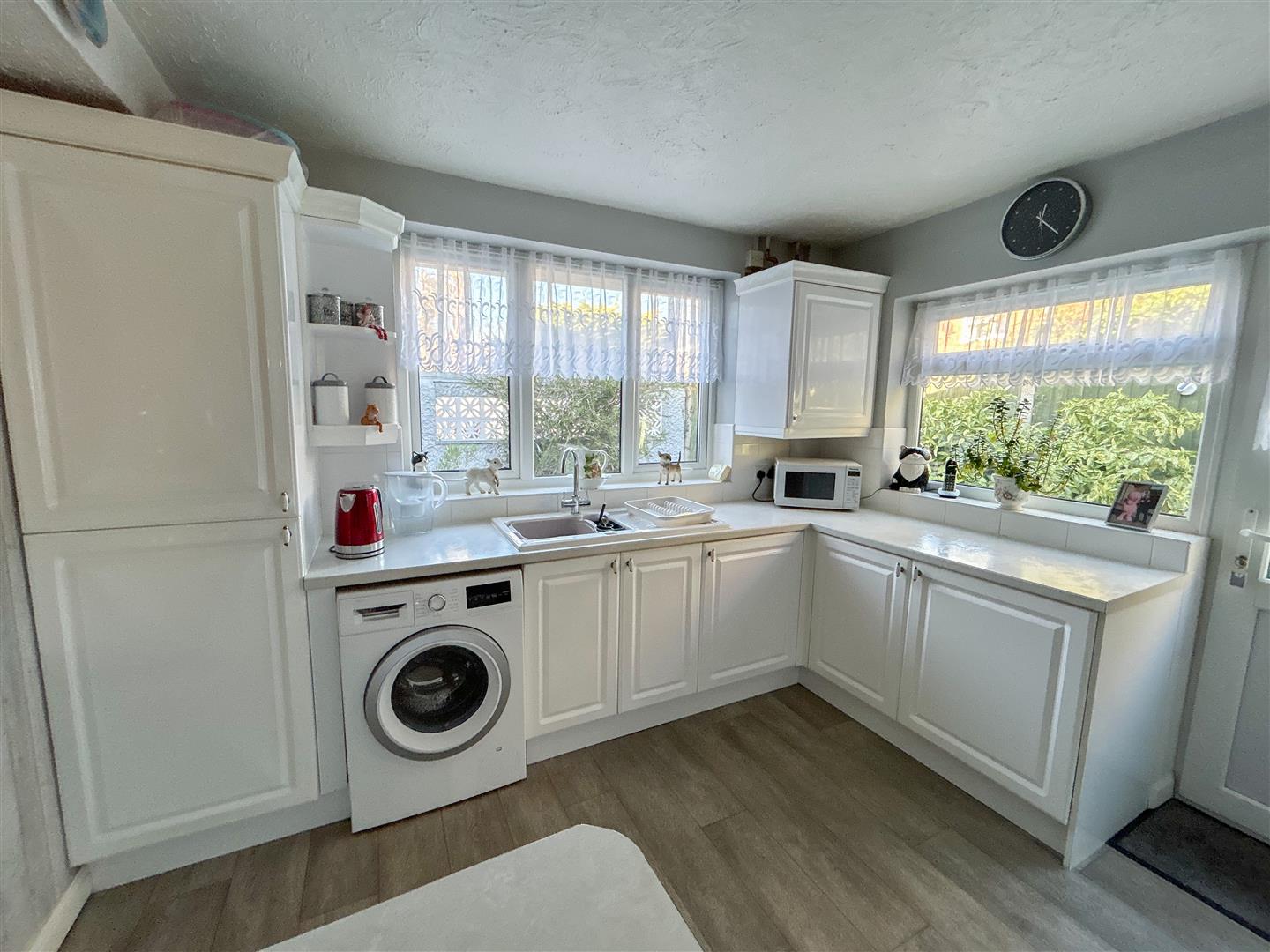 Fitted with a range of wall mounted white fronted panelled units. Comprising; square edge work surfaces with cupboards and drawers below. inset sink unit with mixer tap. Cupboard housing gas combination boiler (not tested). Integrated fridge. Gas cooker with four ring gas hob above with extractor fan. Space and plumbing for washing machine. Open access to lounge. Double glazed window to front and side. Door leading to outside rear.