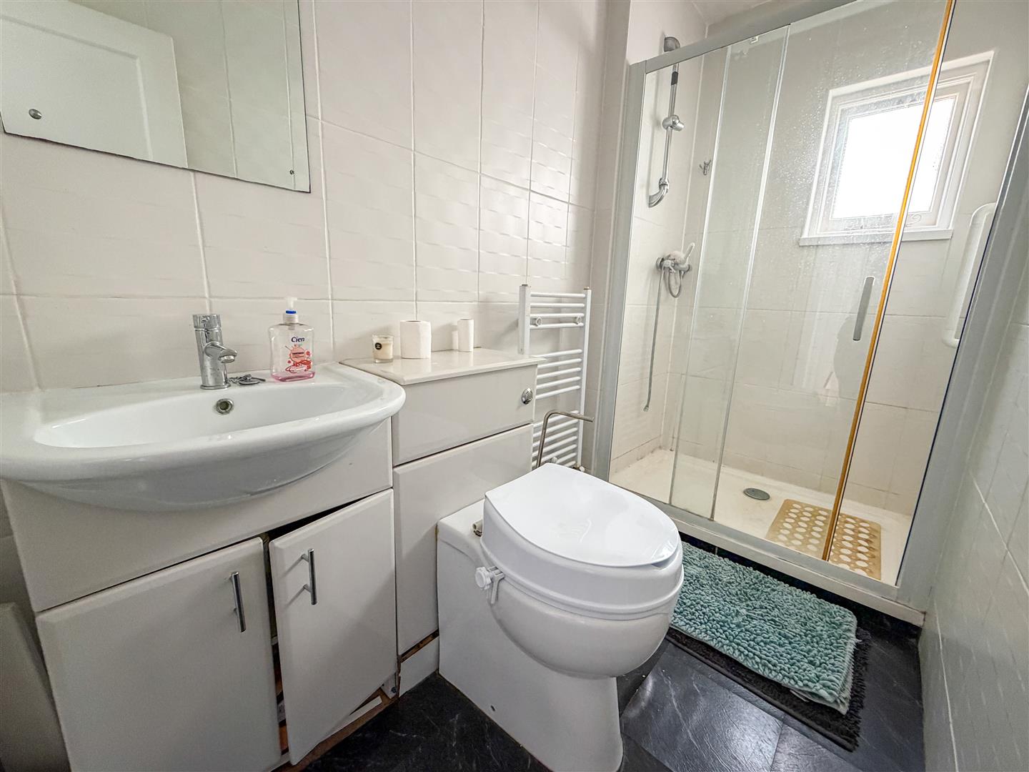 Walk in double shower cubicle with integrated shower unit. Concealed cistern low level W.C. Vanity wash hand basin with cupboards below. Fully tiled walls. Heated towel rail. Tiled flooring. Double glazed window to side.