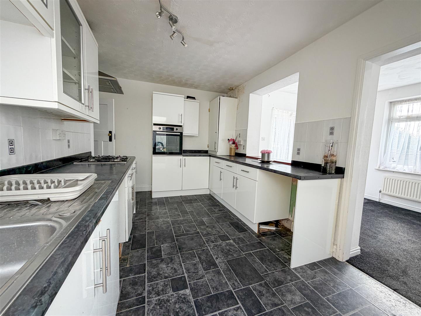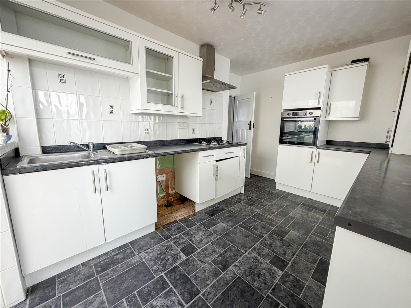 Fitted with a range of White gloss laminate fronted units comprises granite effect laminated rolled edge work surfaces with cupboards and drawers below. Range of matching wall mounted cabinets incorporating part glass fronted units. Inset single drainer stainless steel sink unit with mixer tap. Inset four ring stainless steel gas hob with stainless steel extractor hood above. Inset high level electric oven. (All appliances not tested). Space and plumbing for dishwasher. Under counter fridge space. Tiled splashbacks. Concealed wall mounted gas boiler serving hot water and heating to all central systems (not tested). Open access to utility room. Window and door way to dining room.