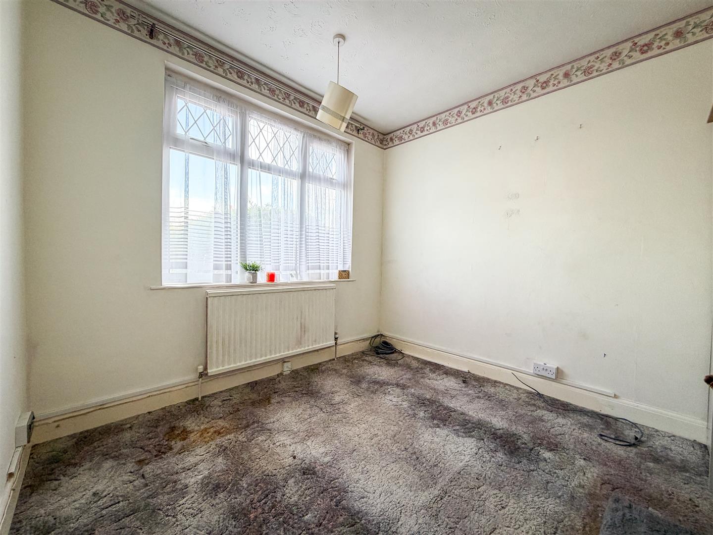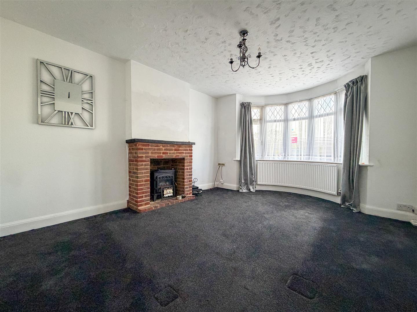 Feature brick fire surround with inset log burner style electric fire (not tested). Curved radiator. Part leaded light effect double glazed curved bay window to front.