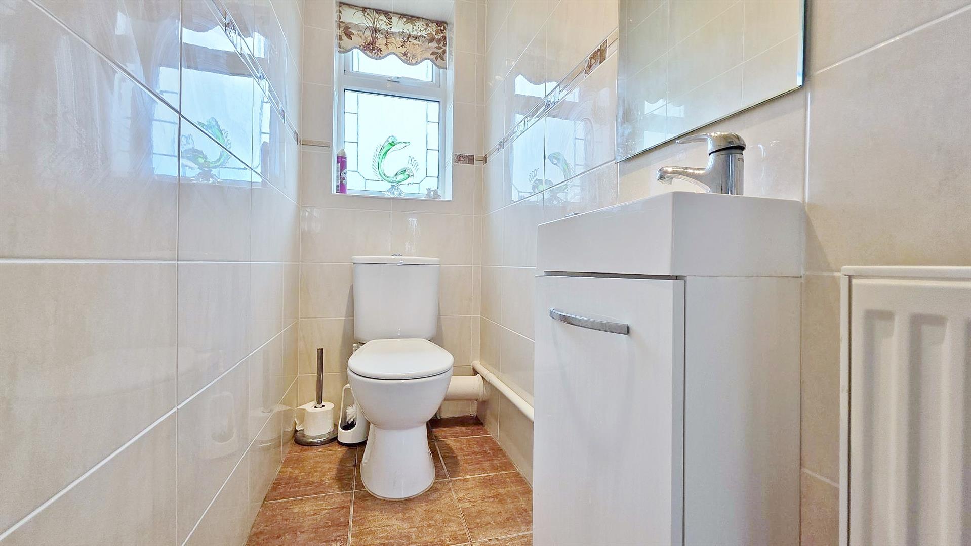 Low level w/c. Vanity wash hand basin with storage cupboard under. Fully tiled walls. Tiled flooring. Radiator. Obscured sealed unit double glazed window to rear.