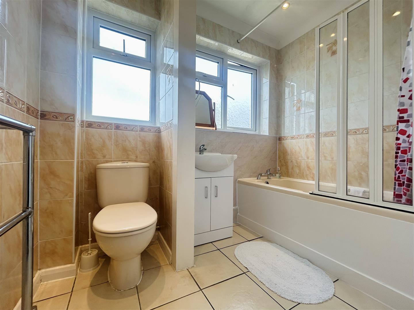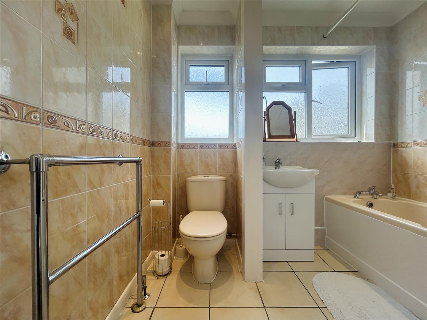 Panelled enclosed bath, shower attachment above. Vanity hand wash basin with storage underneath. Low level W.C. Part tiled & part panelled walls. Tiled flooring. Double glazed windows to rear.