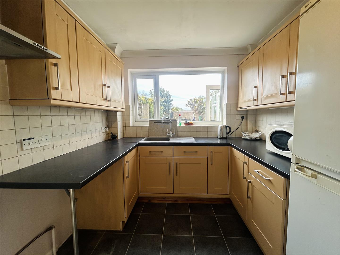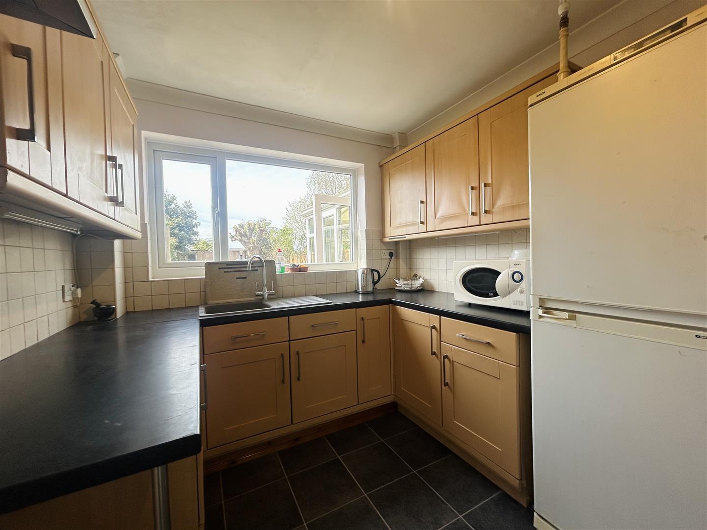 Cupboards at both eye and floor level. Space for freestanding cooker. Extractor hood above. Part tiled walls. Space for fridge freezer. Double glazed UPVC door and double glazed window to rear garden.