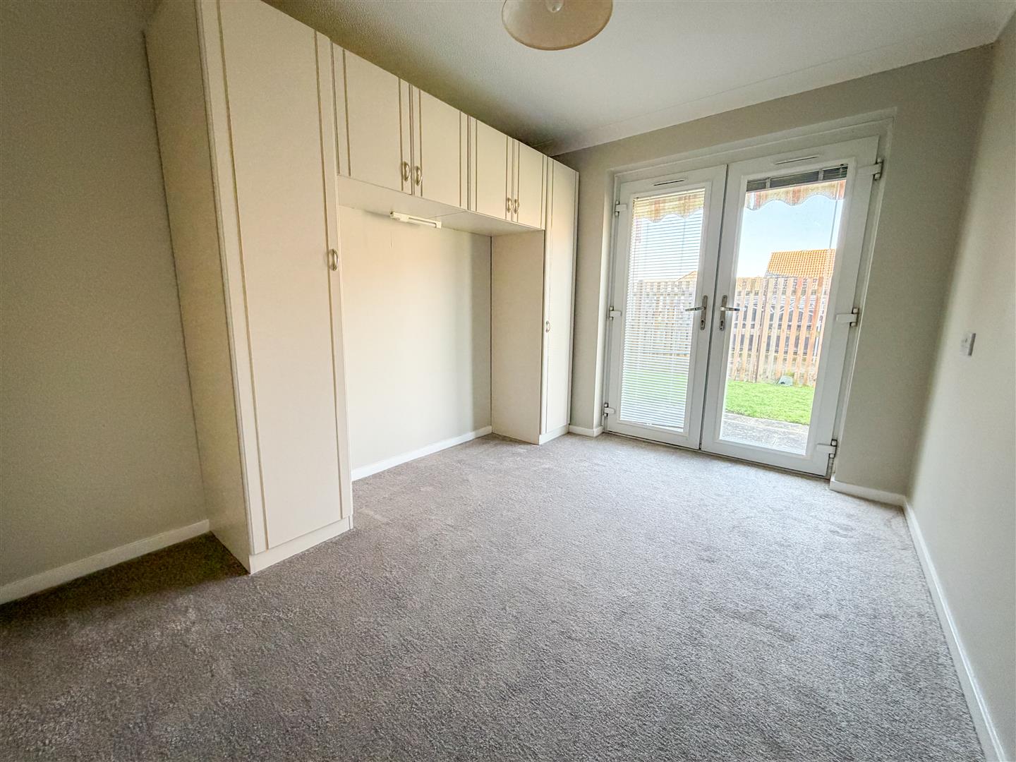 Fitted wardrobes. Cupboards over bed space. Built in airing cupboard. Double glazed double doors opening on to private patio area and communal lawned garden.