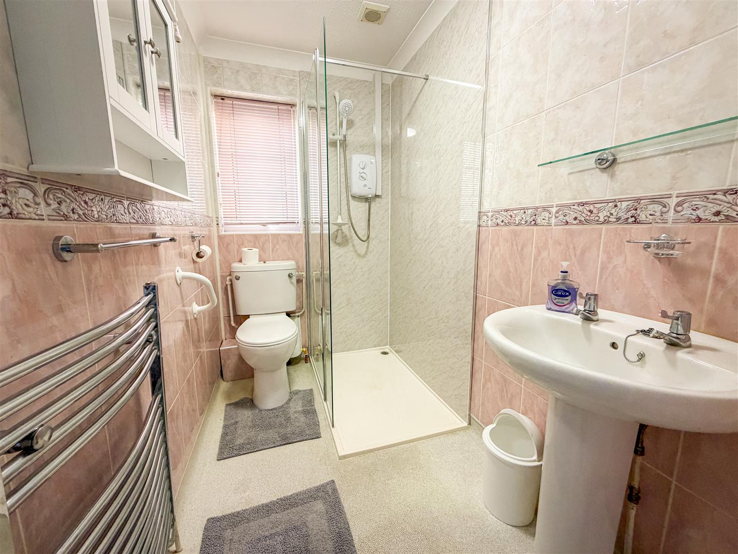 White suite comprising of walk in shower with wall mounted electric shower (n/t). Low level WC. Pedestal hand wash basin. Heated towel rail. Fully tiled walls. Double glazed window.