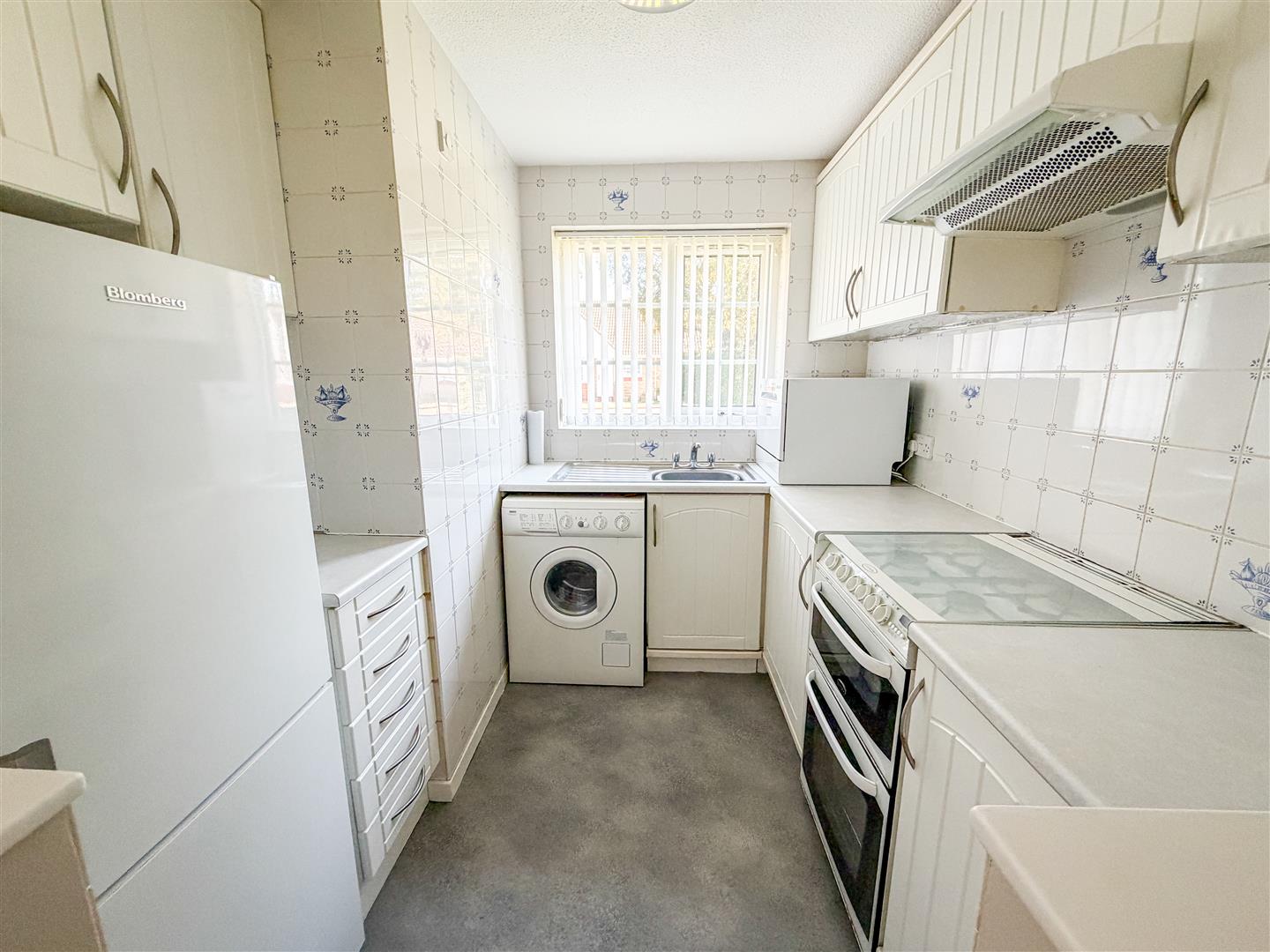 Fitted with a range of white grove panelled laminated fronted units comprises laminated rolled edge work surfaces with cupboards and drawers below. Inset single drainer stainless steel sink unit with mixer tap. Tall fridge freezer space. Space and plumbing for washing machine. Cooker space with fitted extractor hood above (not tested). Tiled splash backs. Double glazed window to front.
