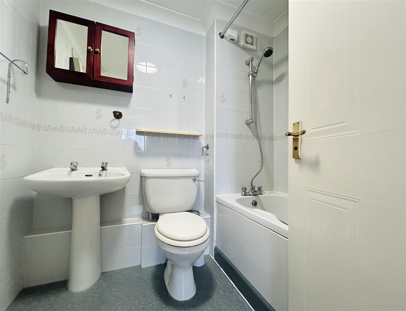 Three piece white suite comprising; Low level W.C. Pedestal hand wash sink basin. Panelled bath with wall mounted shower head attachment above. Fully tiled.