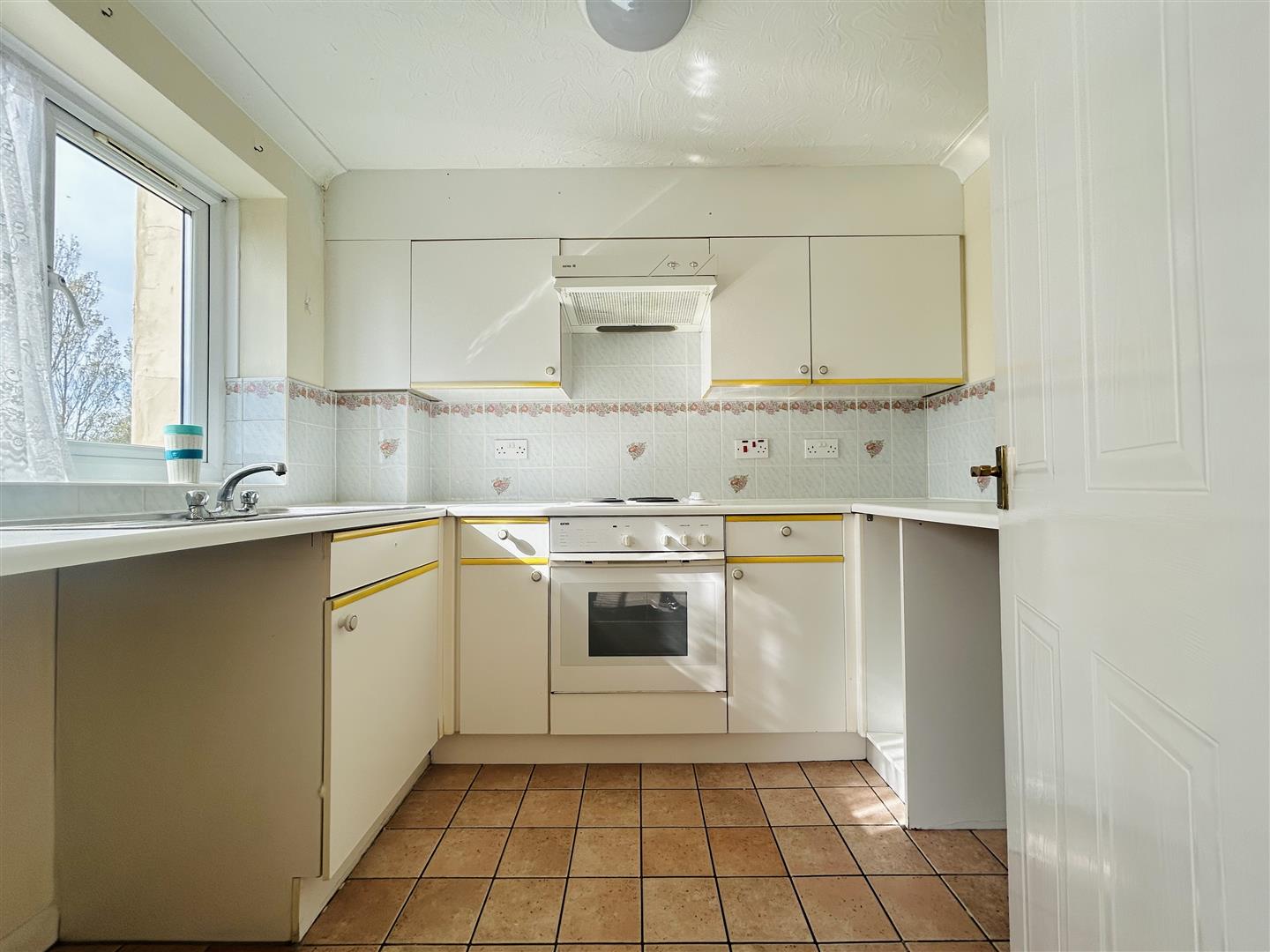 Fitted kitchen suite comprising; Laminated rolled edge work surfaces with single drainer stainless steel sink unit with stainless steel mixer tap. Inset four ring electric with oven under and extractor hood above. Space and plumbing for washing machine. Space for fridge and freezer. Selection of matching wall units and cupboards and drawers at both eye and floor level. Part tiled. Double glazed window to front offering distant sea views.