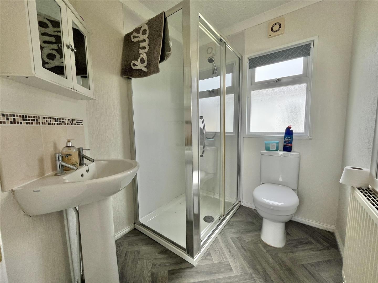 Three piece suite comprising low level W.C. Pedestal wash hand sink basin. Step in shower cubicle with wall mounted electric shower above (not tested). Radiator. Double glazed window to side.