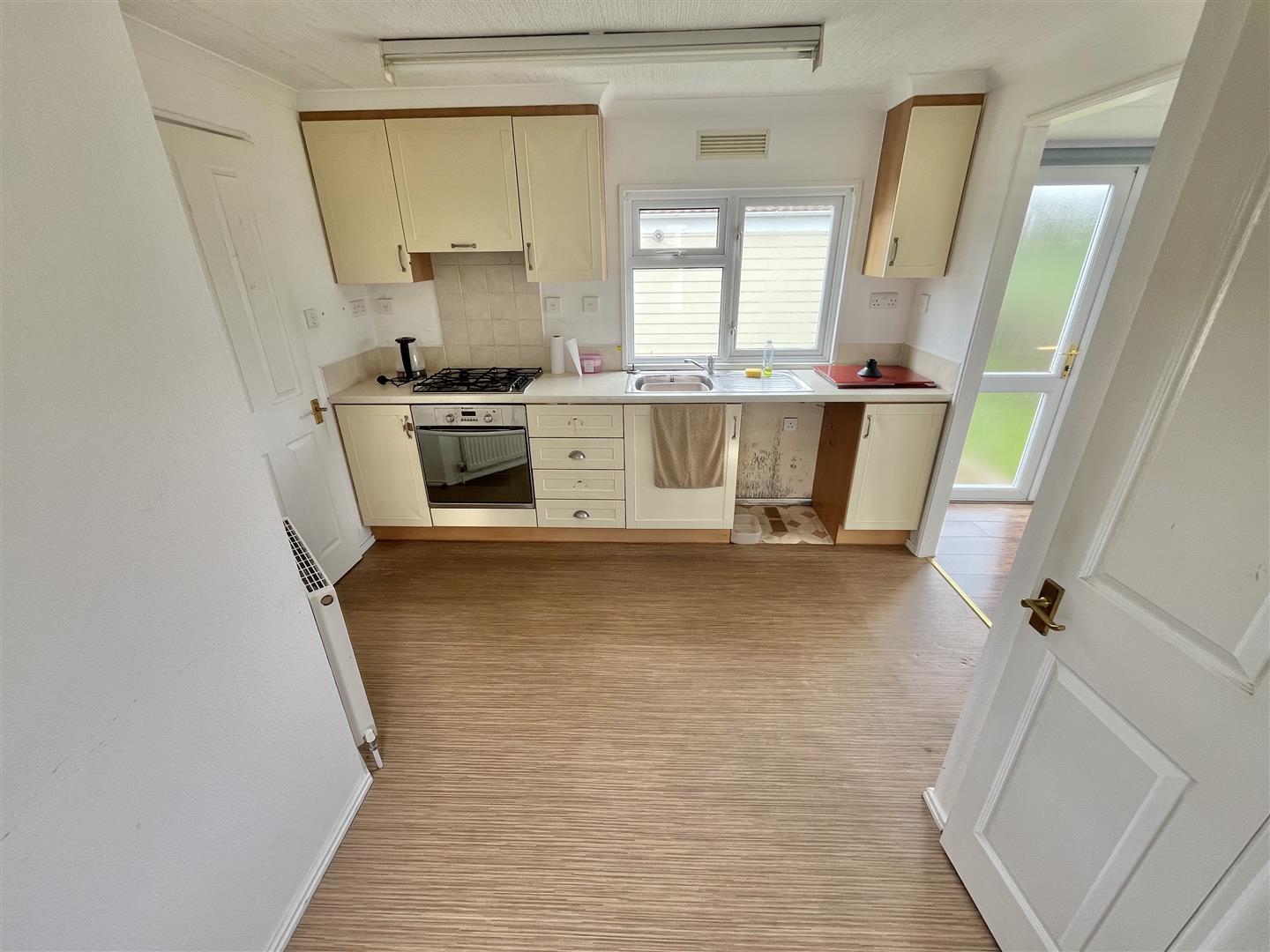 Fitted kitchen suite comprising White marble effect rolled edge work surfaces with Crème wall mounted units with cupboards and drawers below. Inset single drainer stainless steel sink unit with mixer tap. Inset oven. Inset four ring gas hob with extractor hood above. Cupboard housing gas combination boiler. (All appliances not tested). Space for fridge freezer. Space for washing machine. Storage cupboard. Two radiators. Two double glazed windows to side.