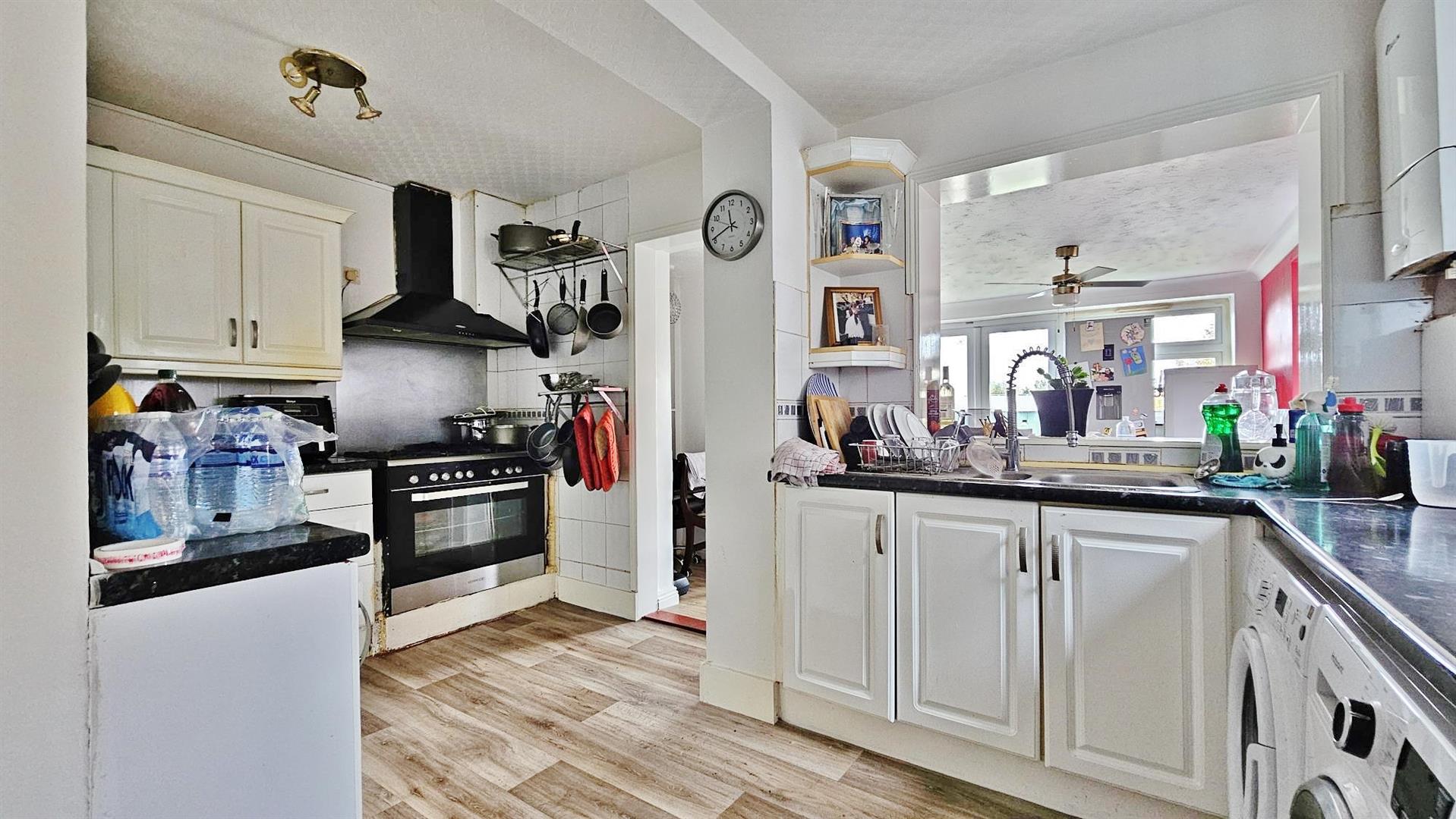 Fitted with a range of matching fronted units. Rolled edge work surfaces. Inset one and half stainless bowl sink and drainer unit. Cooker to remain. Further selection of matching units. Part tiled walls. Vinyl flooring. Wall mounted combination boiler providing heating and hot water throughout. Plumbing for washing machines. Glass display cupboards. Sealed unit double window to side. Open access to: