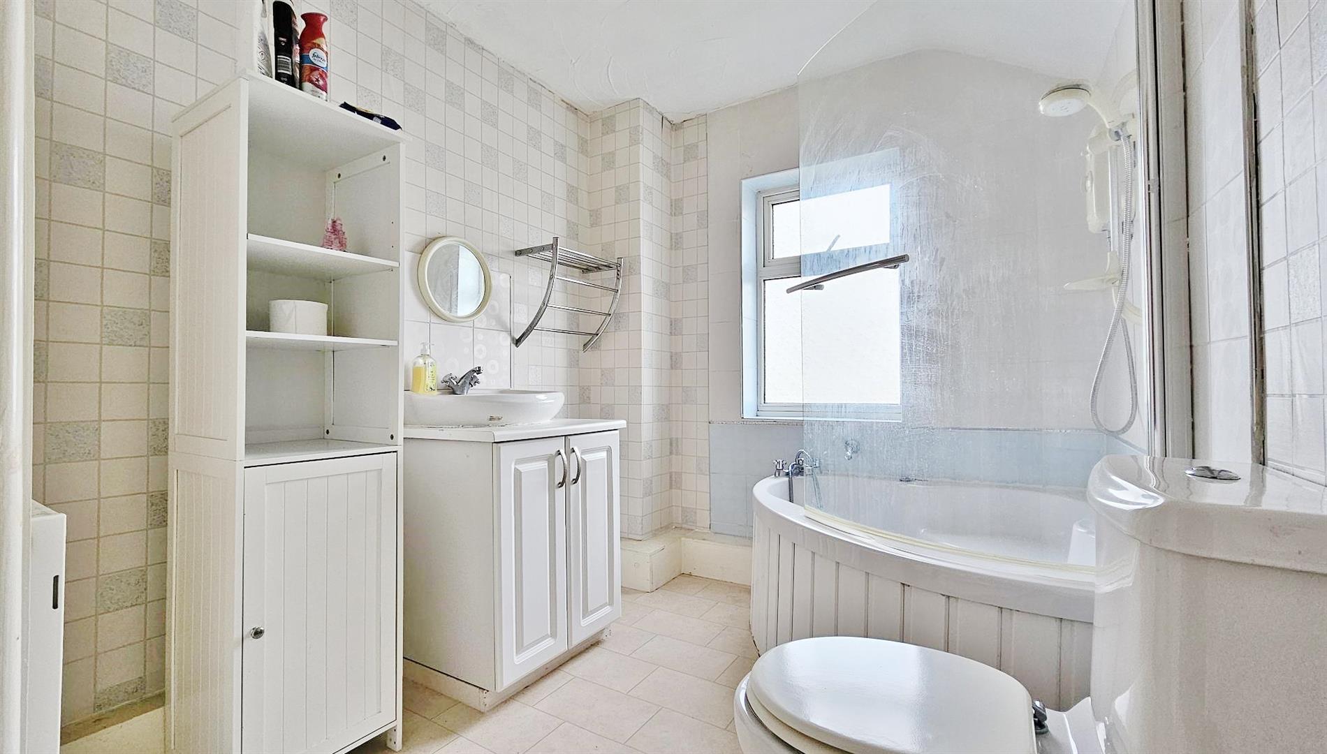 White suite comprises of low level WC. Vanity wash hand basin with cupboard under. Corner bath with fitted shower screen and wall mounted shower attachment. Vinyl flooring. Radiator. Obscured sealed unit double glazed window to rear.