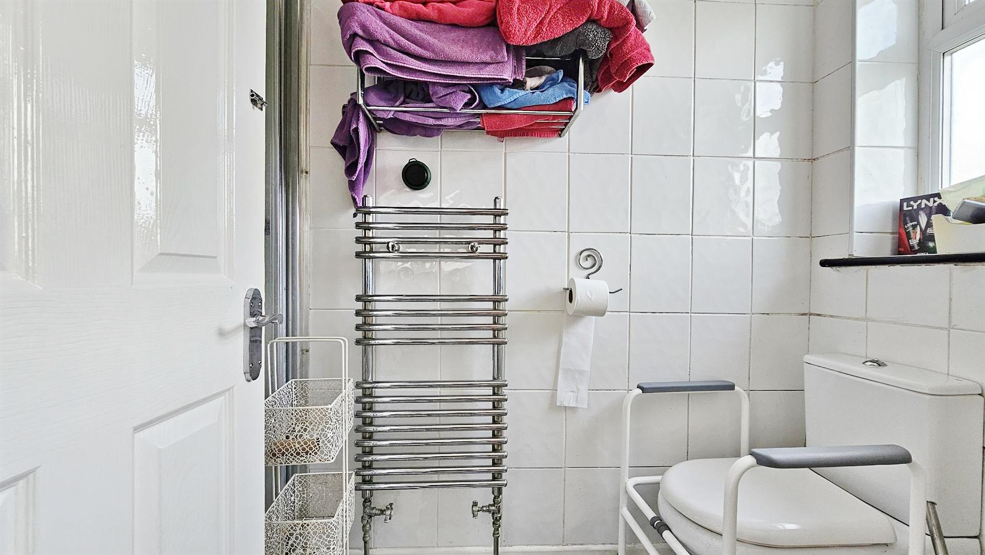 Suite comprises of low level WC. Vanity wash hand basin with mixer tap and cupboard under. Enclosed shower cubicle with wall mounted shower attachments. Fully tiled walls. Tiled flooring. Wall mounted heated towel rail. Extractor fan. Obscured sealed unit double glazed window to rear.
