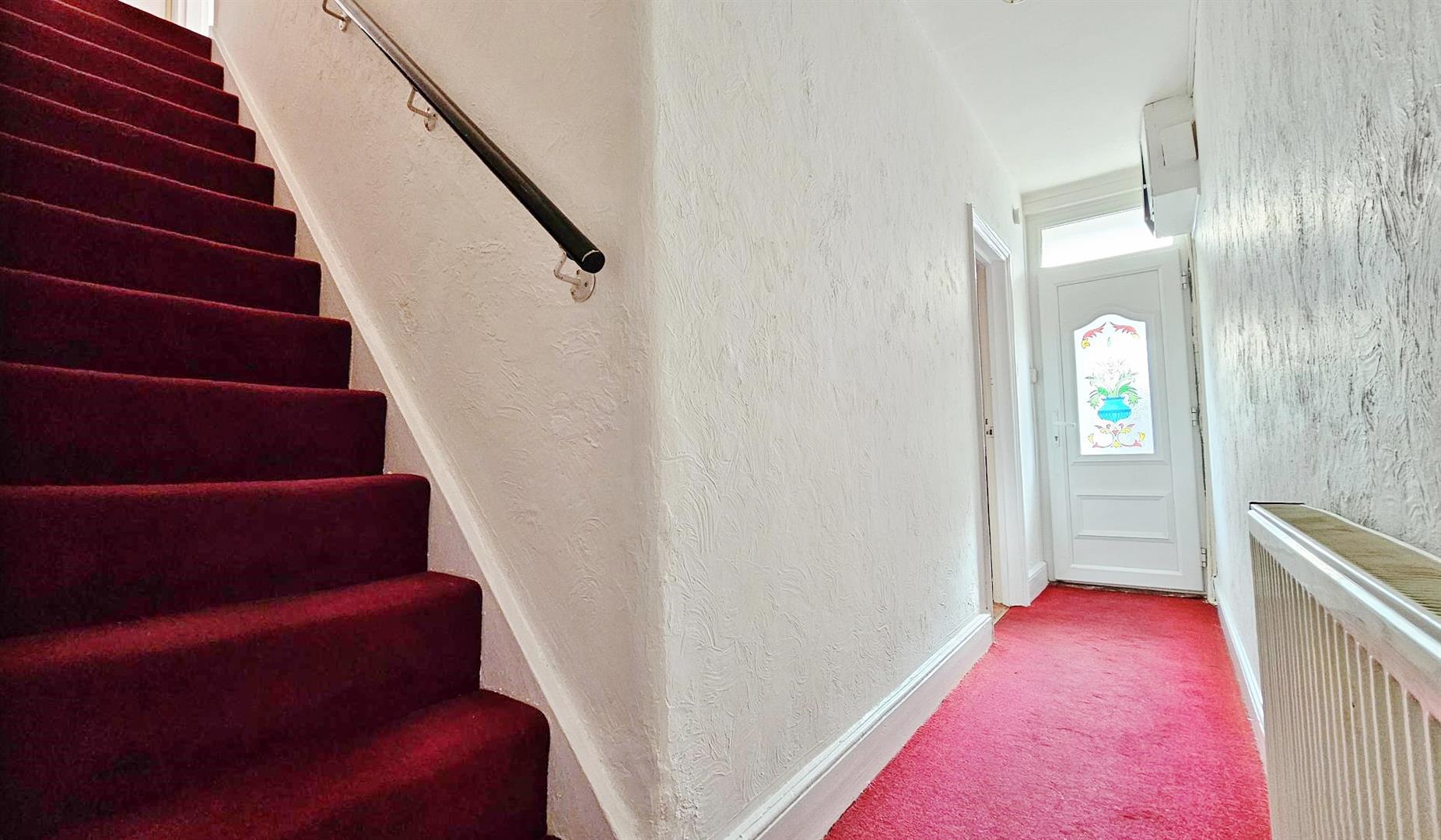 Under stairs storage cupboard. Marble featured surround with inset electric fire. Radiator. Sealed unit double glazed windows to side. Open access to: