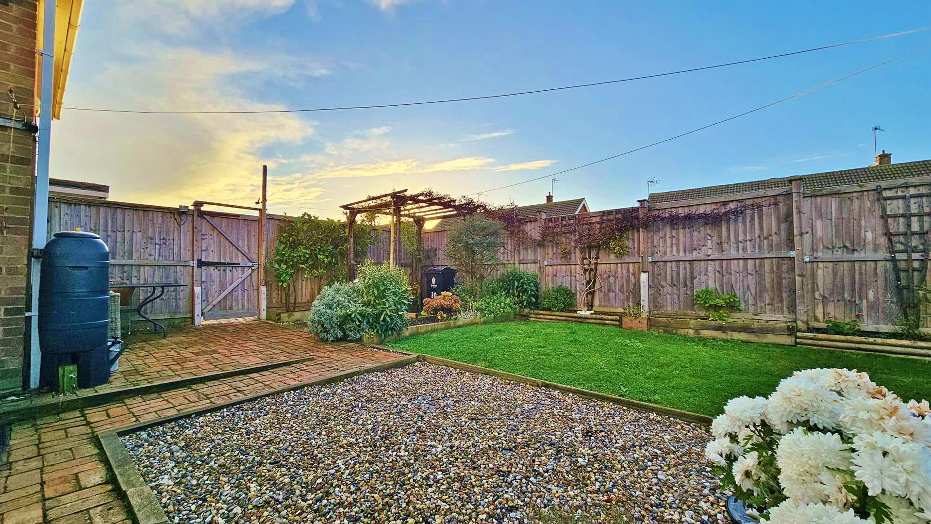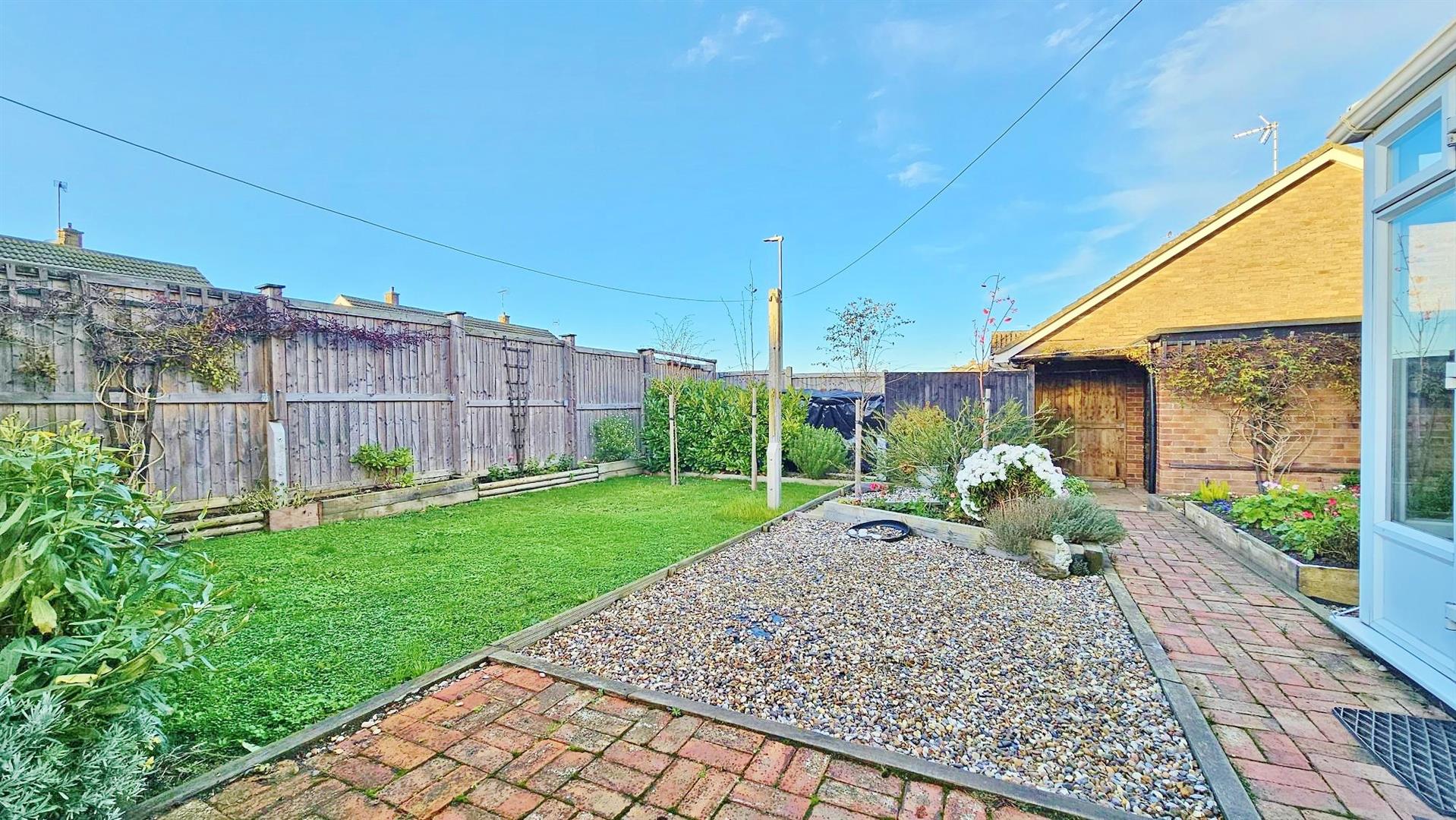 Corner plot position. Part block paved area. Remainder laid to lawn and shingled area. Raised beds stocked with flowers. Additional driveway providing off street parking leading to garage with up and over door. Access to front via side gate. Enclosed by panelled fencing.