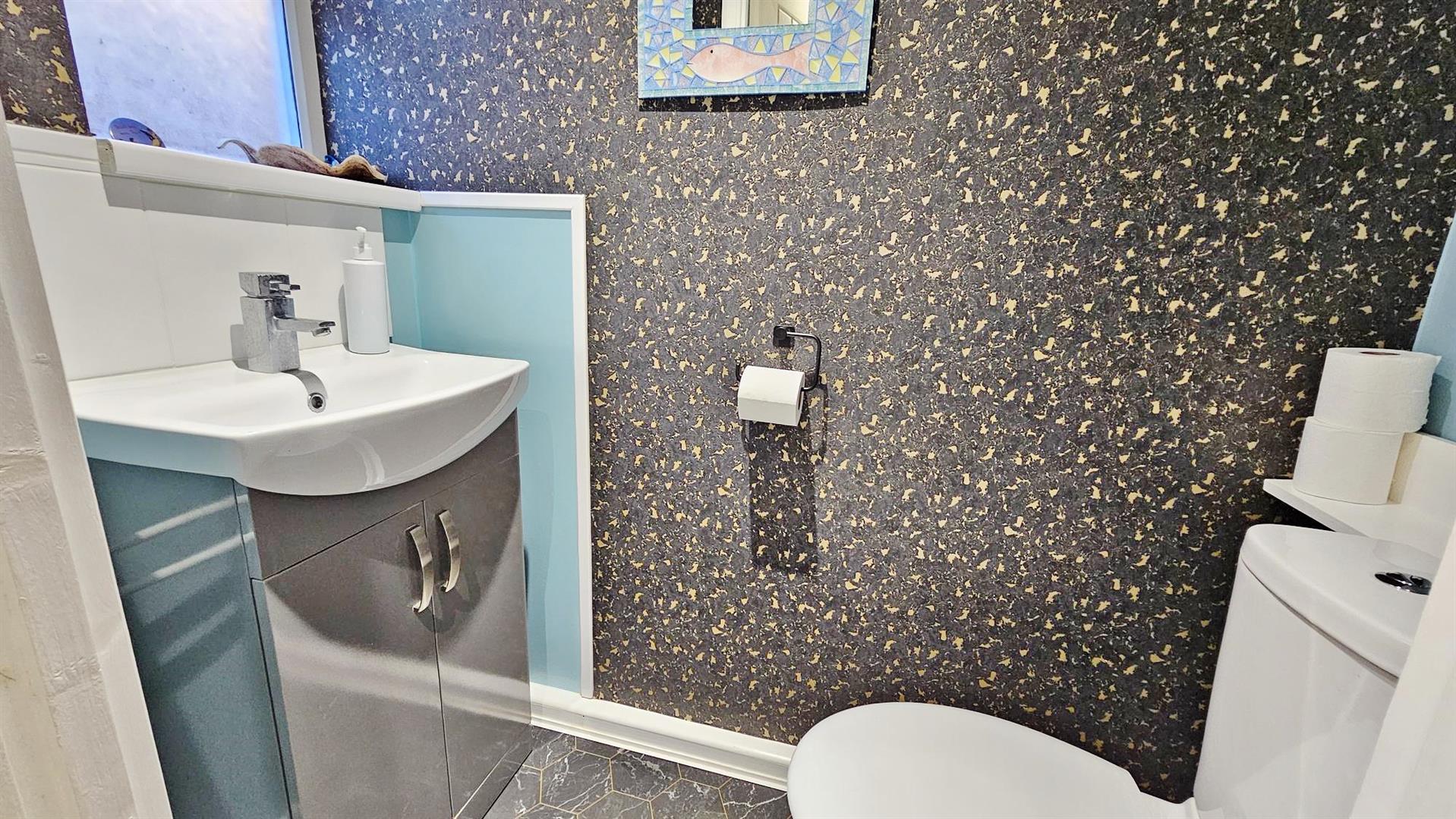 Low level WC. Vanity wash hand basin with mixer tap and storage cupboard under. Tiled splashback. Vinyl flooring. Spotlight. Obscured sealed unit double glazed window to side.