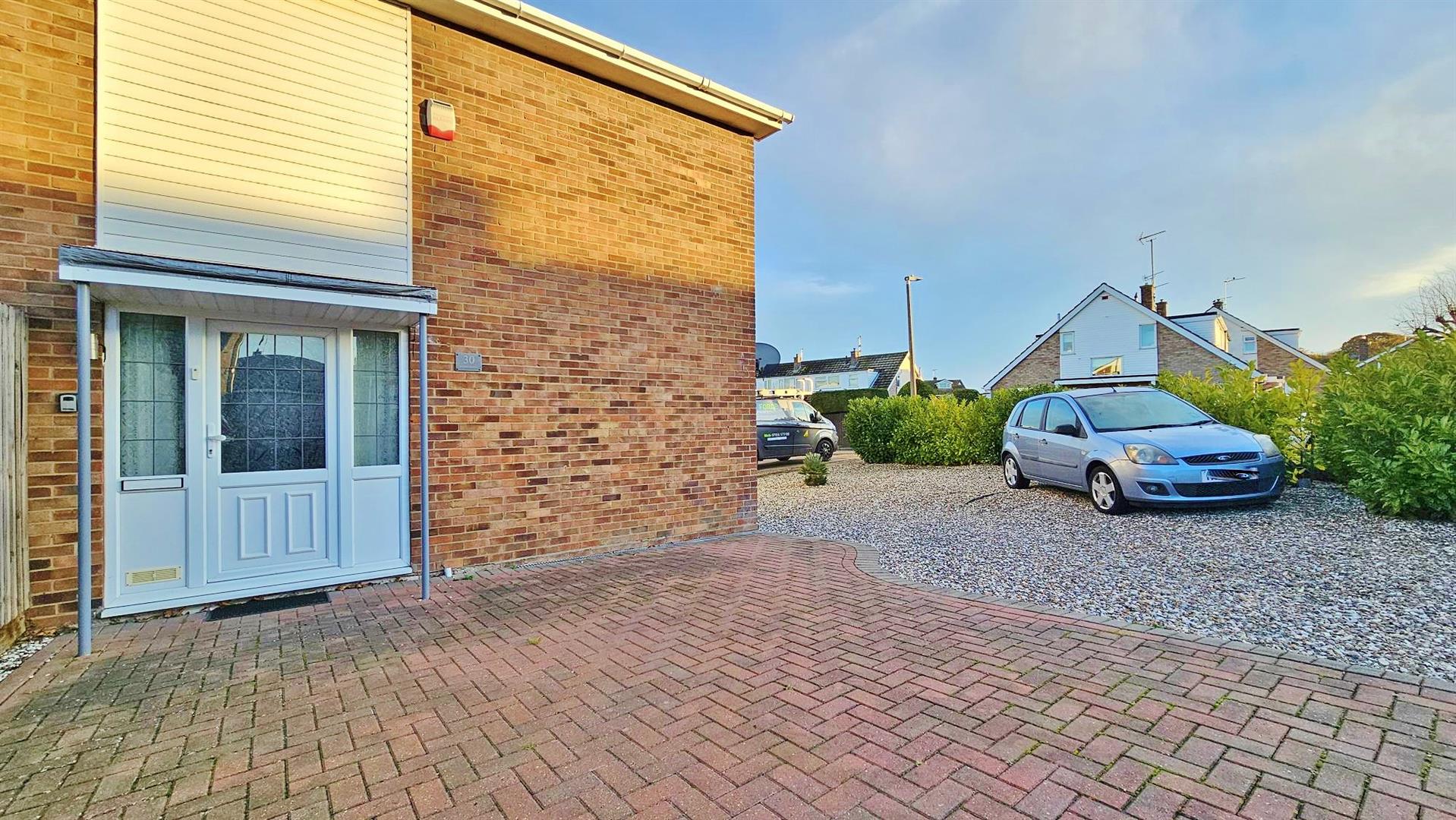 Block paved driveway providing off street parking for several vehicles. Remainder laid to shingle providing further parking space.