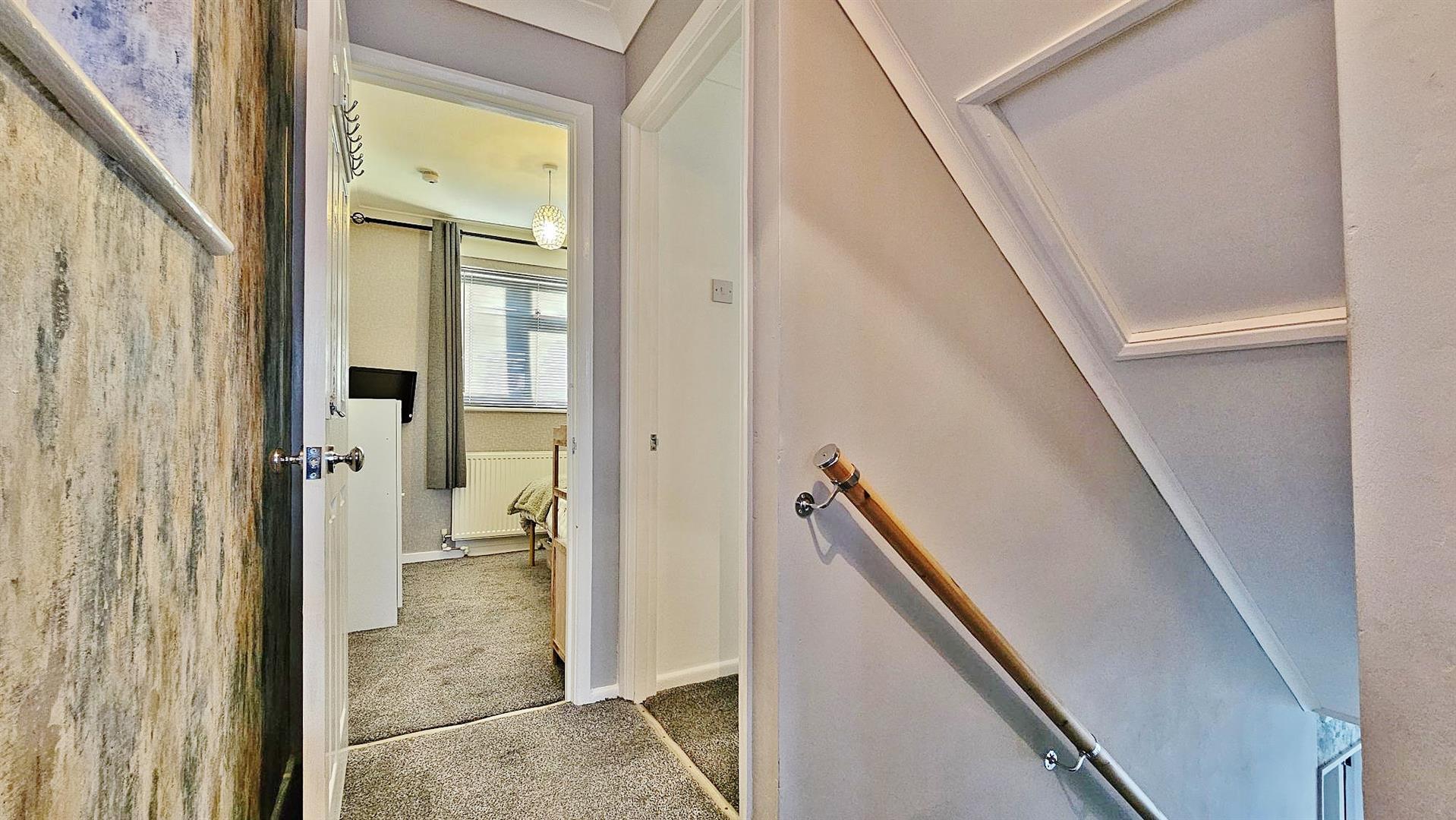 Stair flight to first floor. Under stairs storage cupboard. Laminate flooring. Tall standing featured radiator. Door to: