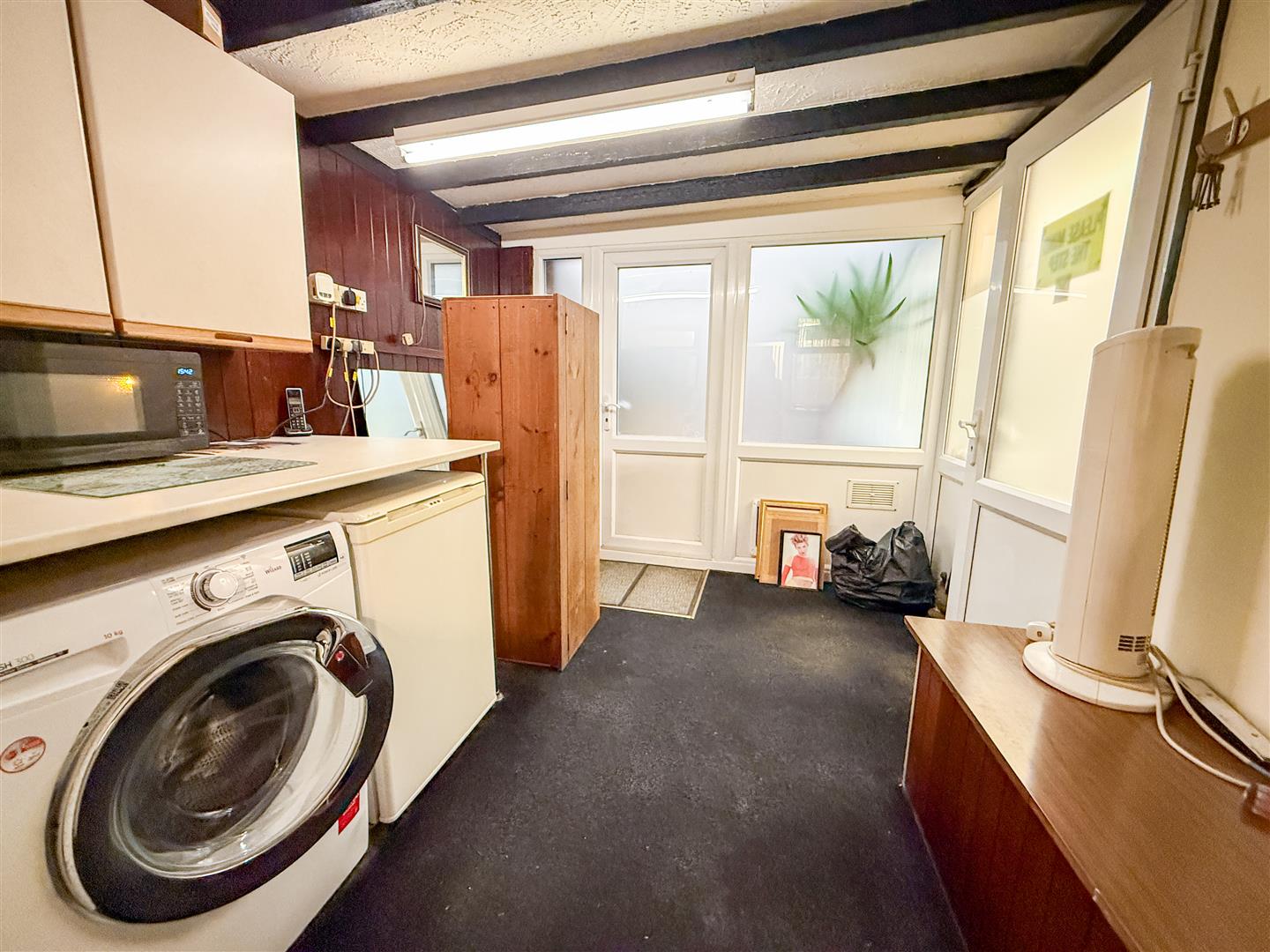 Fitted sink unit with storage under. Mix of storage cabinets and wall mounted units. This part was also fitted out as a hairdressers with Two hair dressing sinks. Double glazed window to side. Double glazed door to: