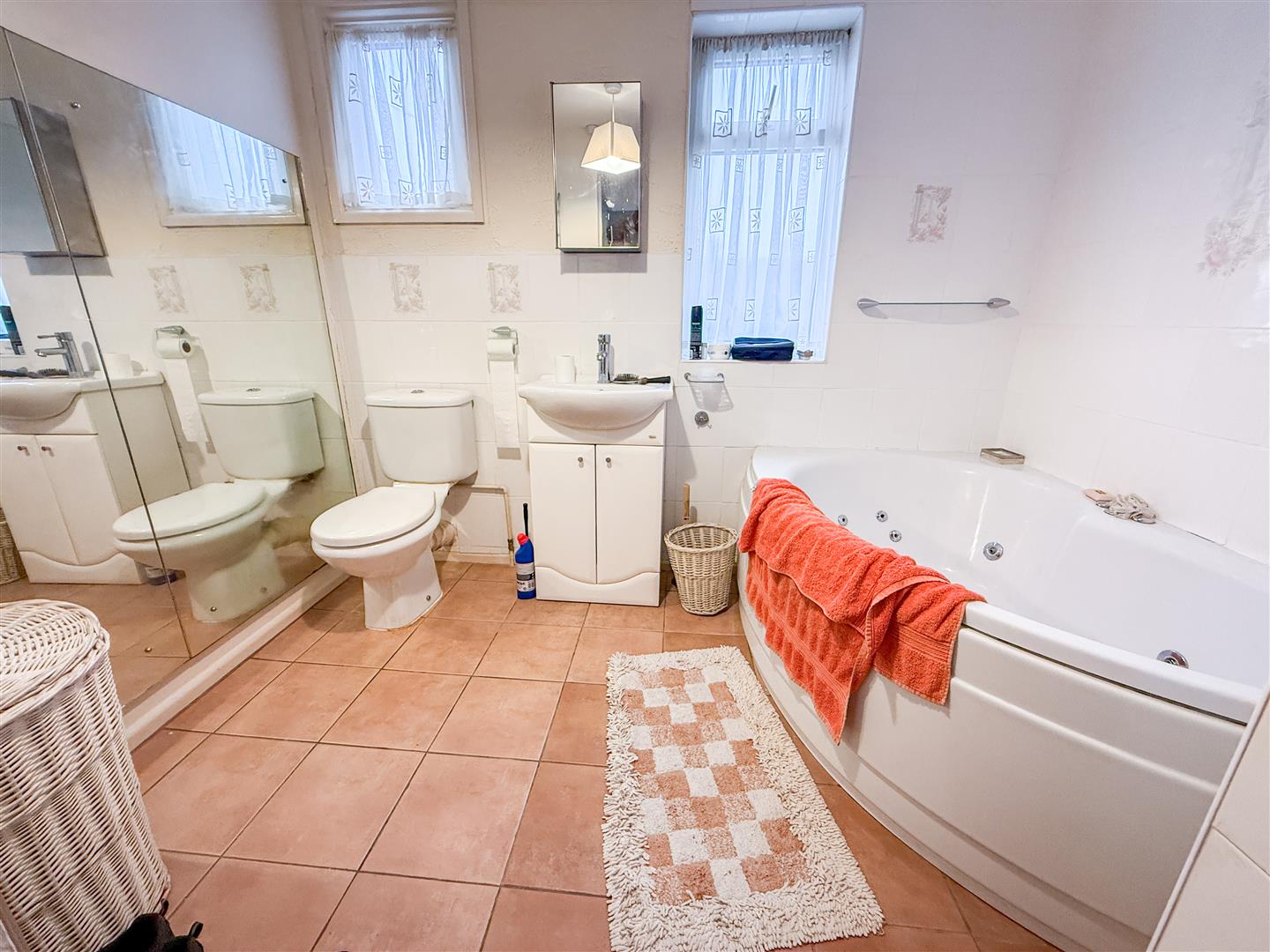 Fitted with a three piece white suite comprising corner jacuzzi panelled bath. Vanity wash hand basin with cupboards below. Low level W.C. Fully tiled walls. Tiled effect flooring. Built in double airing cupboard. Two double glazed windows to rear.
