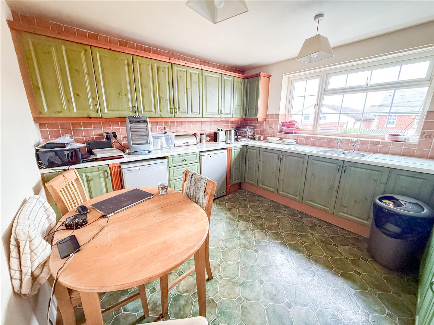 Fitted with a range of Sage pine effect panel fronted units comprising laminated rolled edge work surfaces with cupboards and drawers below. Range of matching wall mounted units. Inset single drainer stainless steel sink unit. Inset high level double electric oven. Inset four ring ceramic hob with extractor fan above. Under counter fridge and freezer spaces. Tiled splashbacks. Radiator. Double glazed window to rear.
