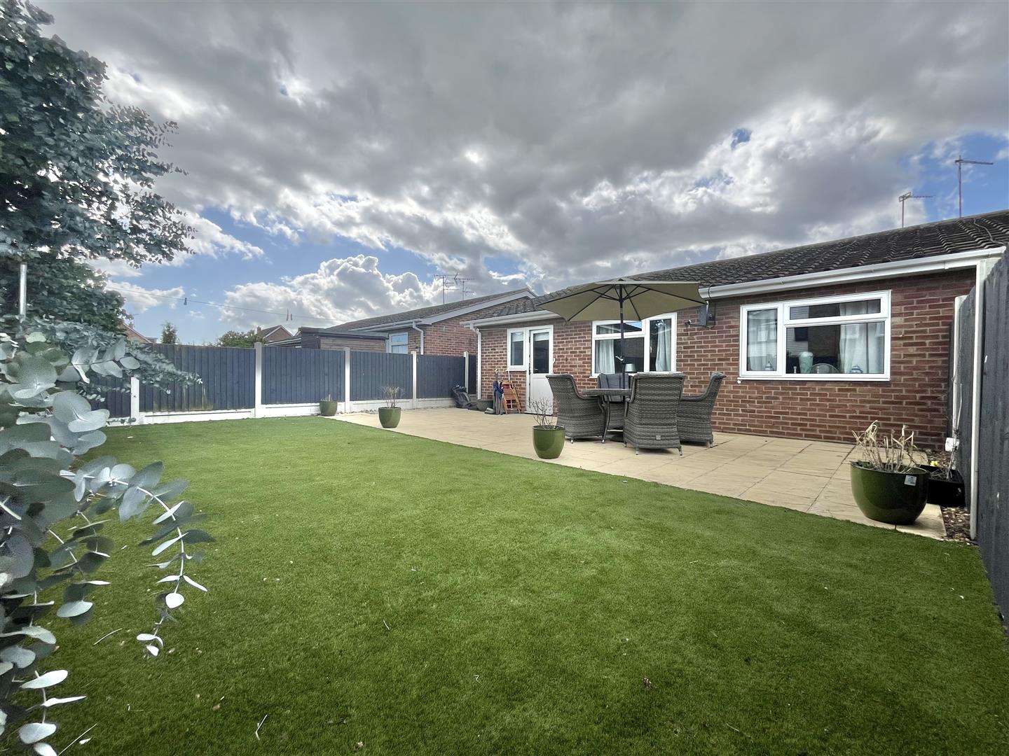 Part paved patio area with the remainder being laid to artificial lawn.