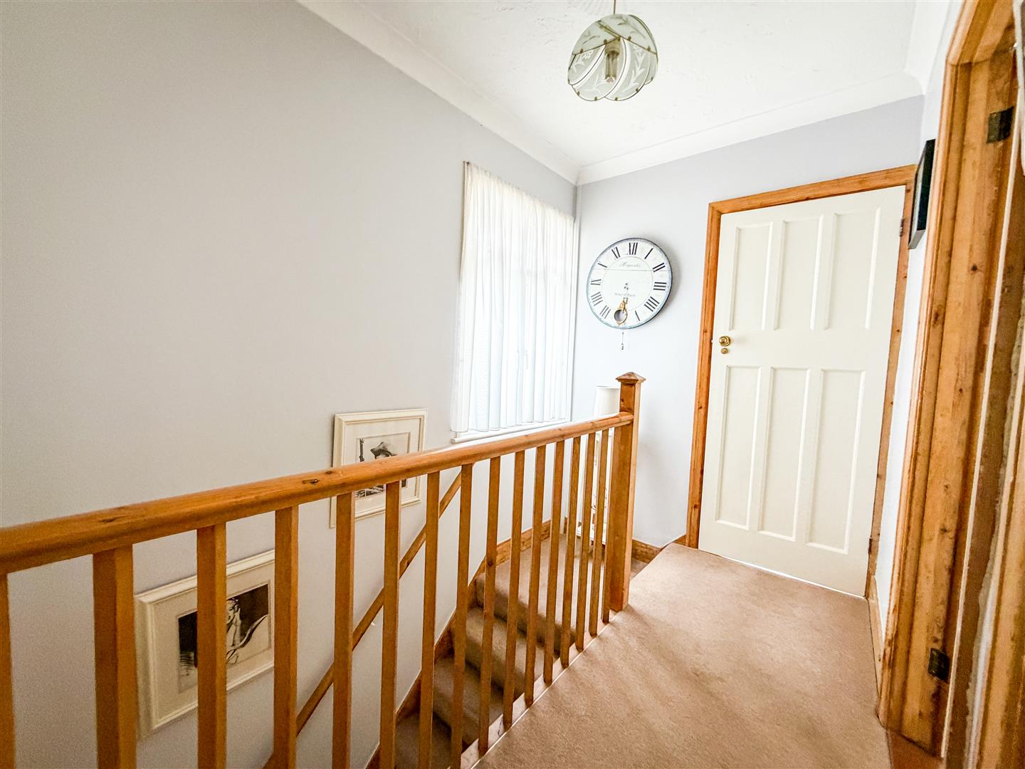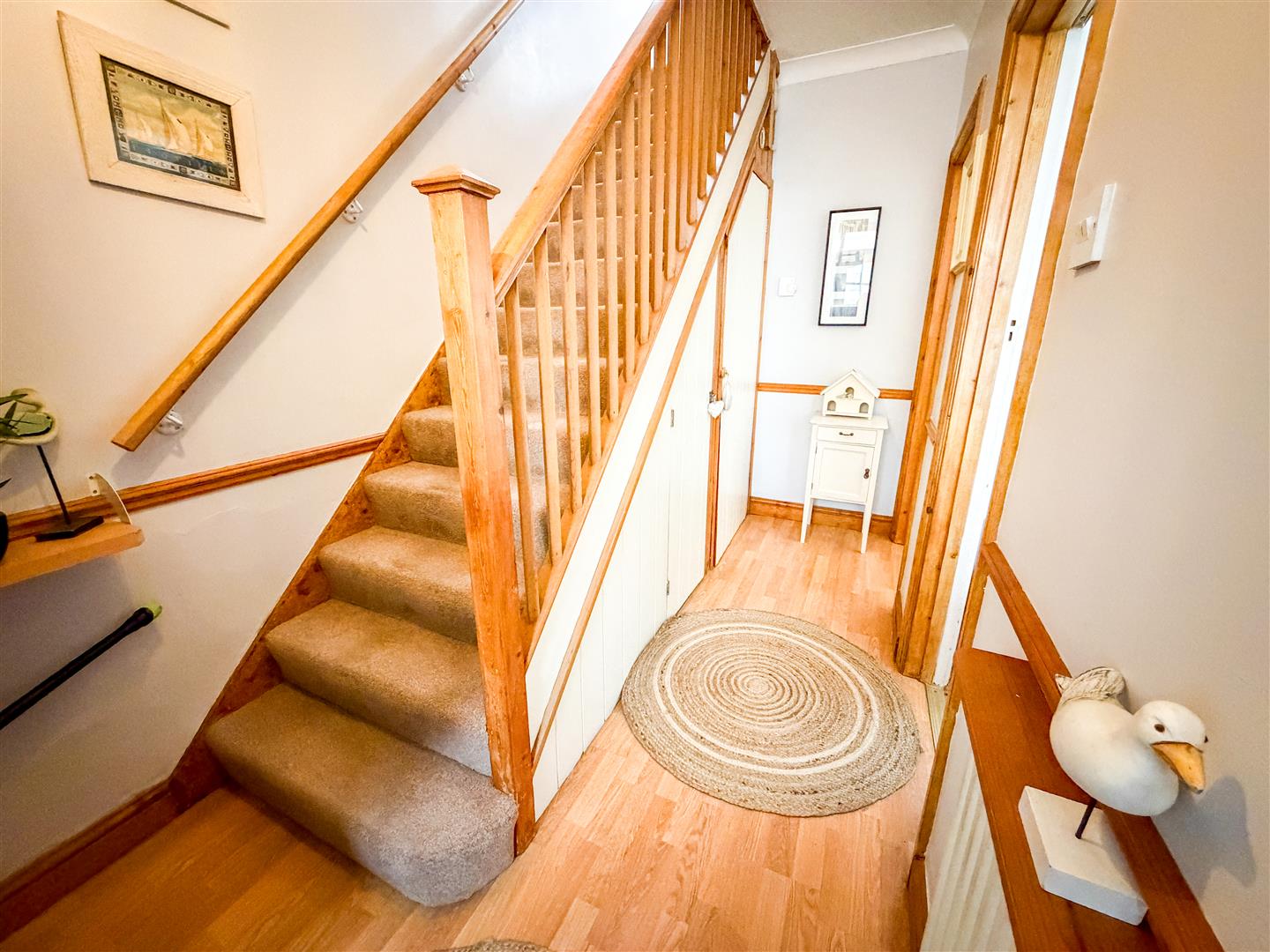 Stair flight to first floor with built in under stairs storage cupboard. Radiator. Dado rail. Wood effect flooring. Doors to: