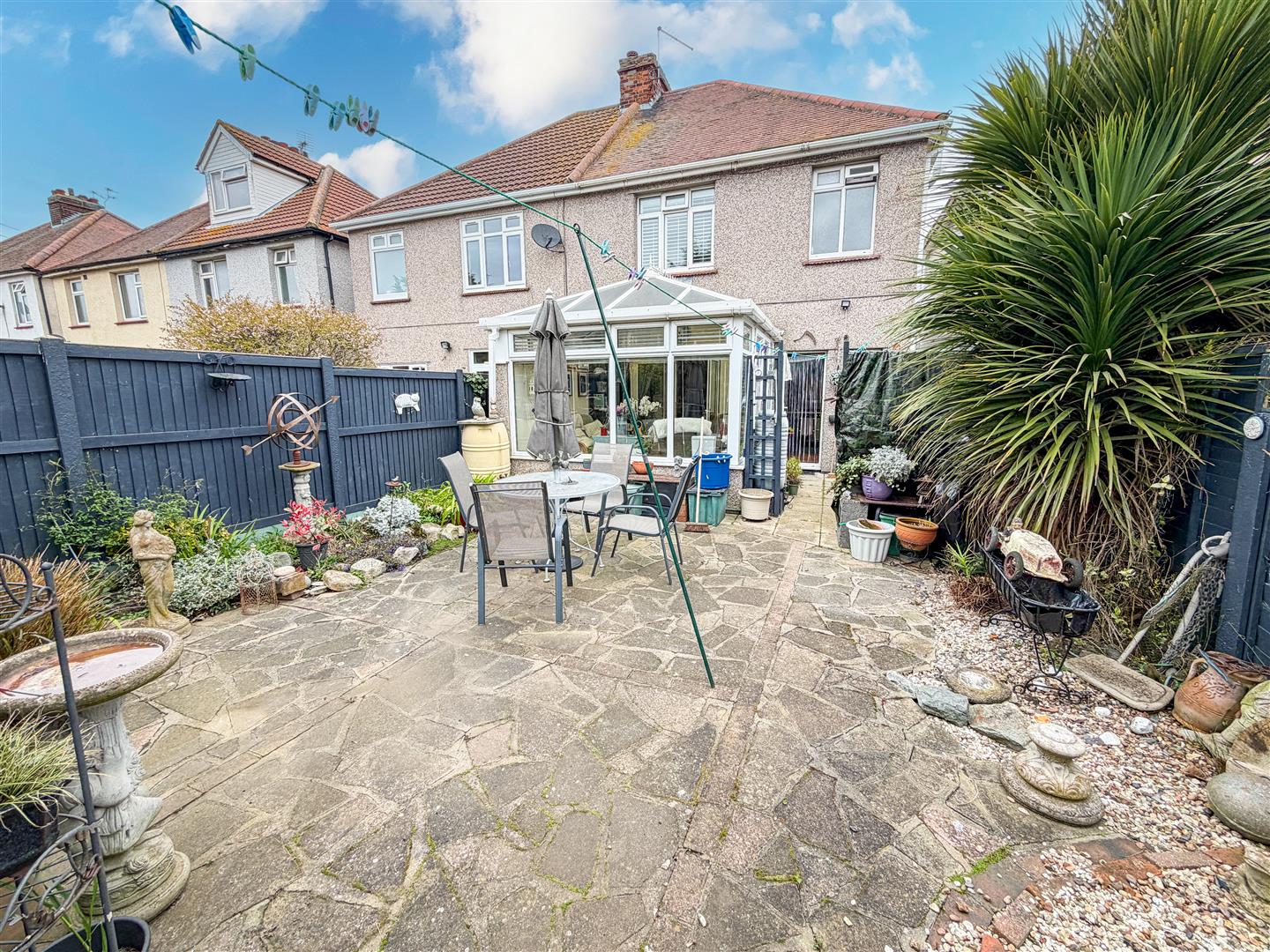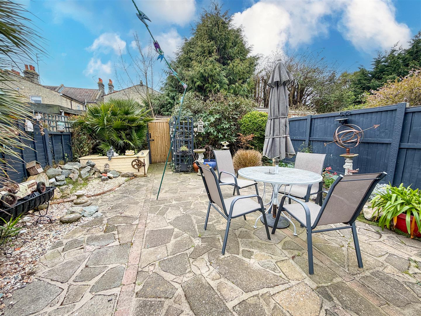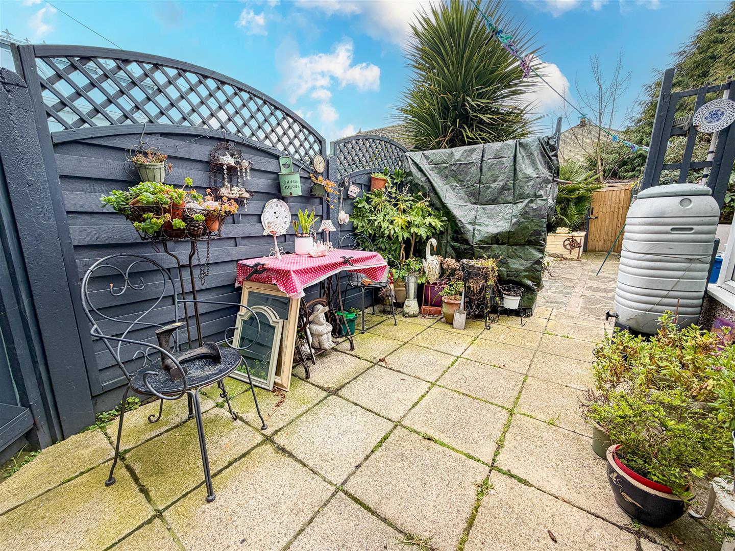 Low maintenance rear garden which is mainly laid to paving with flower and shrub borders. Additional raised flower bed. Array of shrubs. Gate leads to additional garden area. Enclosed by panelled fencing.