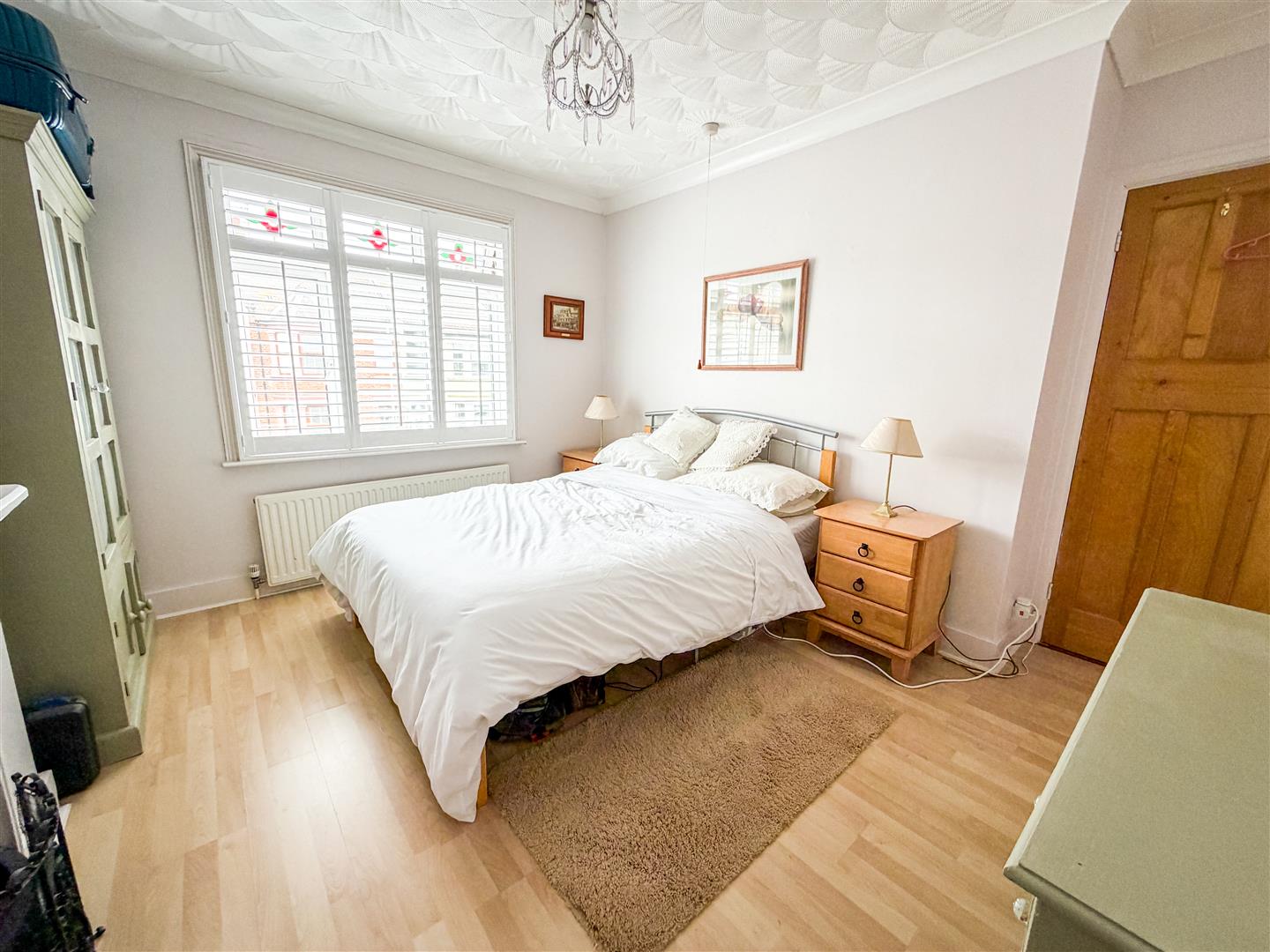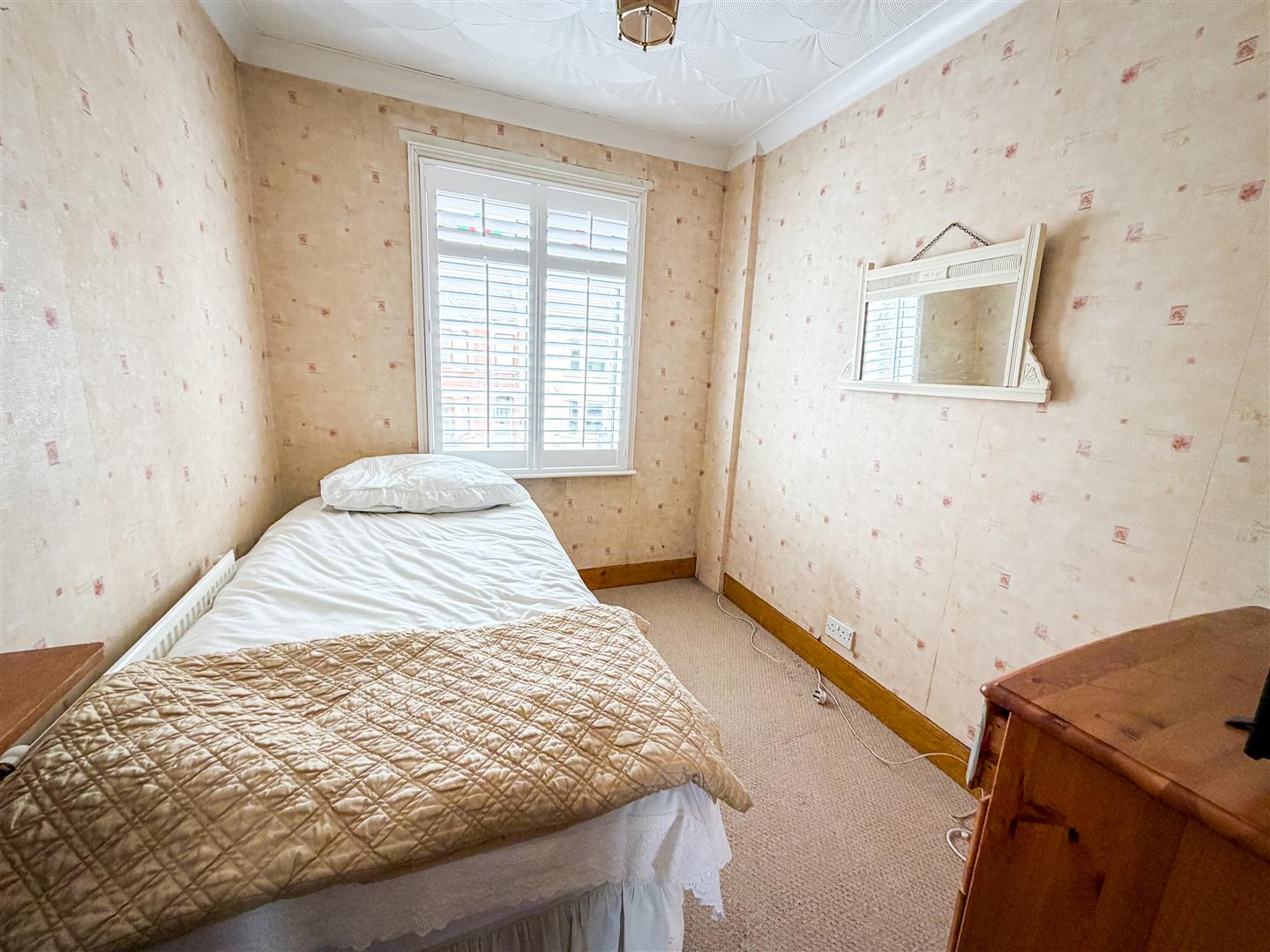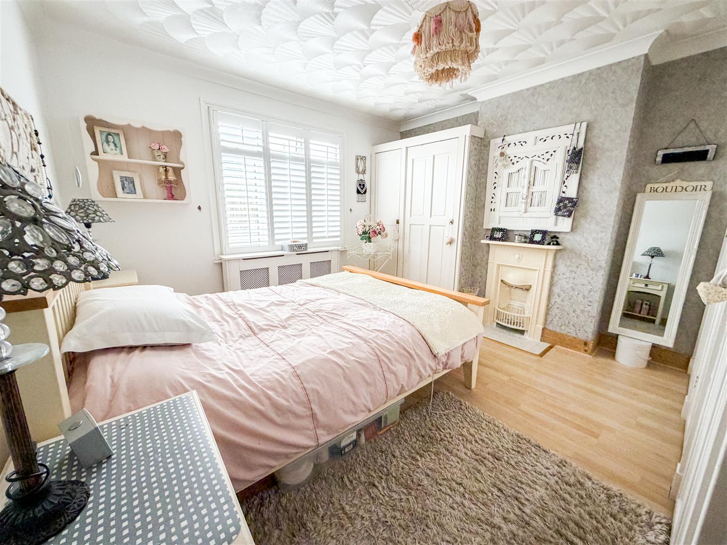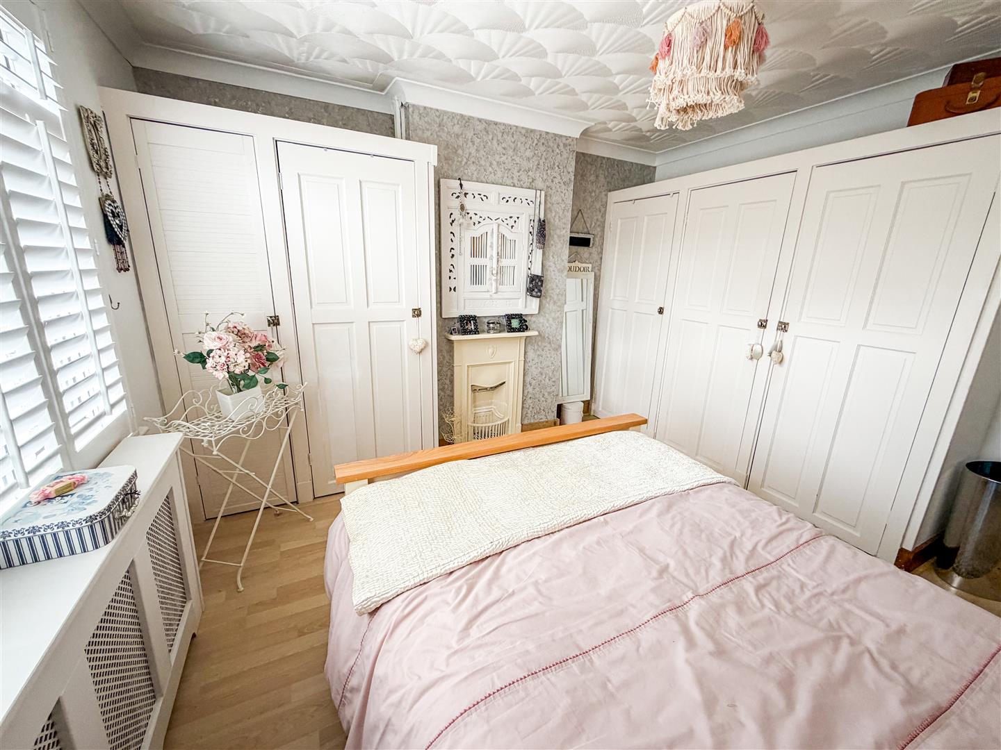 Ornamental fireplace. Wood effect flooring. Built in airing cupboard. Fitted wardrobes. Radiator. Double glazed window to rear with fitted shutter blinds.