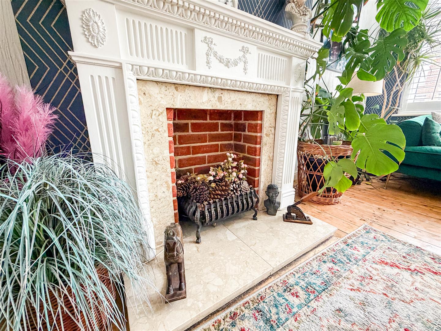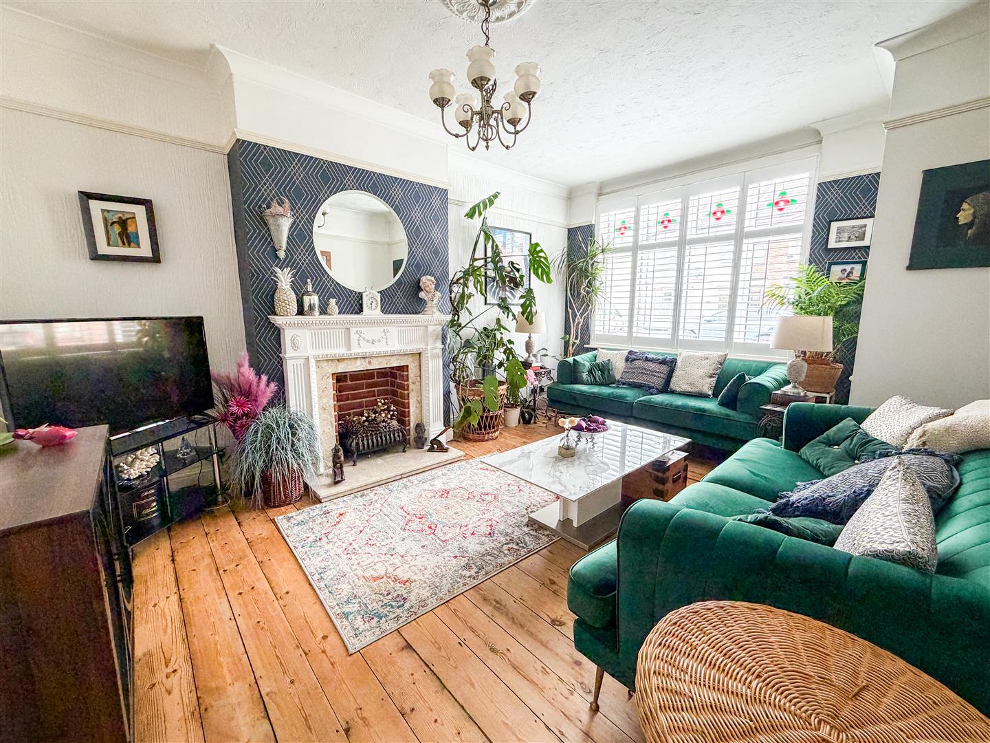 Feature fireplace. Picture rail. Radiator. Exposed wooden floor boards. Part leaded light and stained glass effect double glazed bay window to front with fitted shutter blinds.