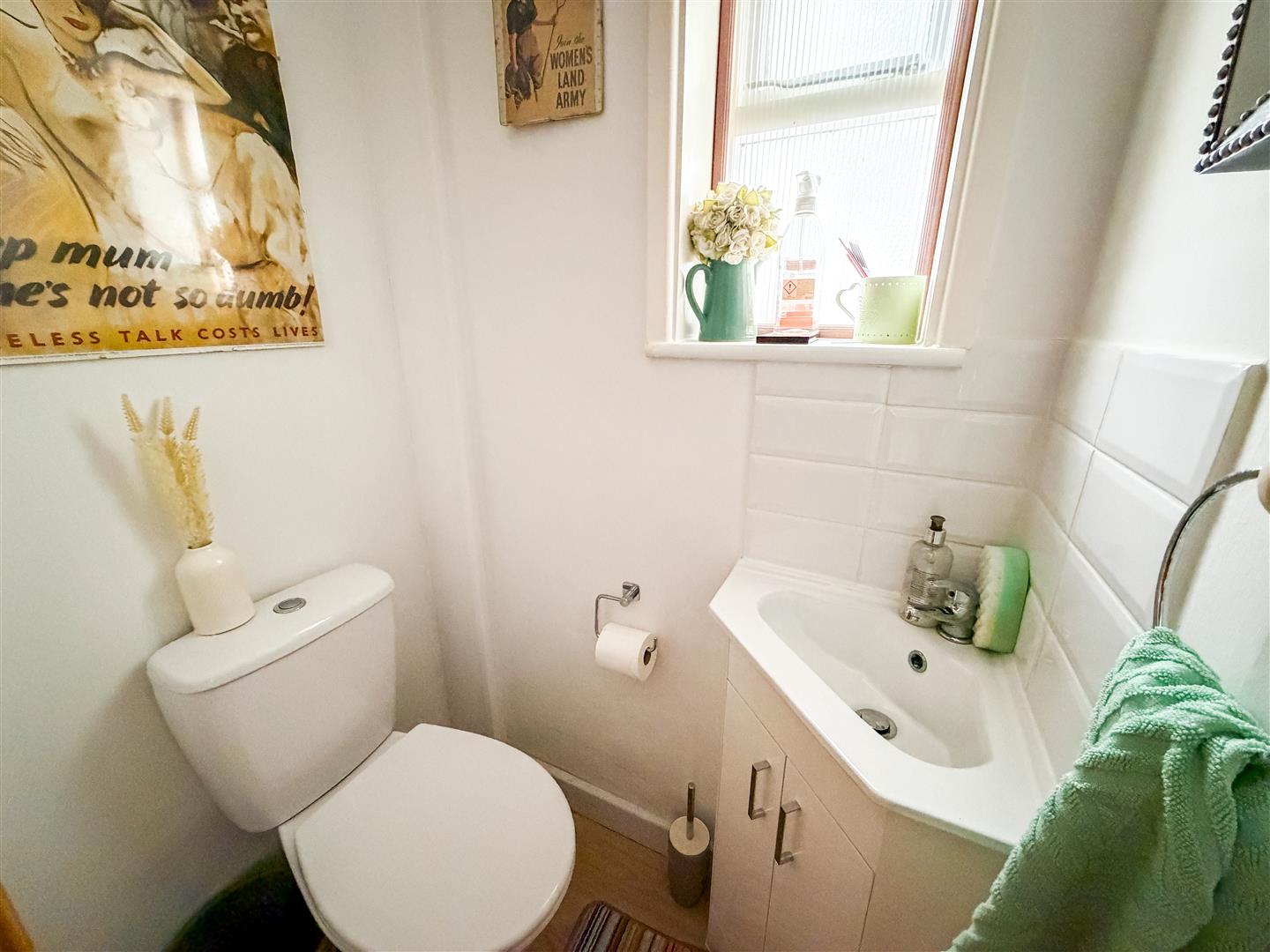 Fitted with a White suite comprises low level W.C. Corner vanity wash hand basin with cupboards below. Tiled splashbacks. Double glazed window to side.