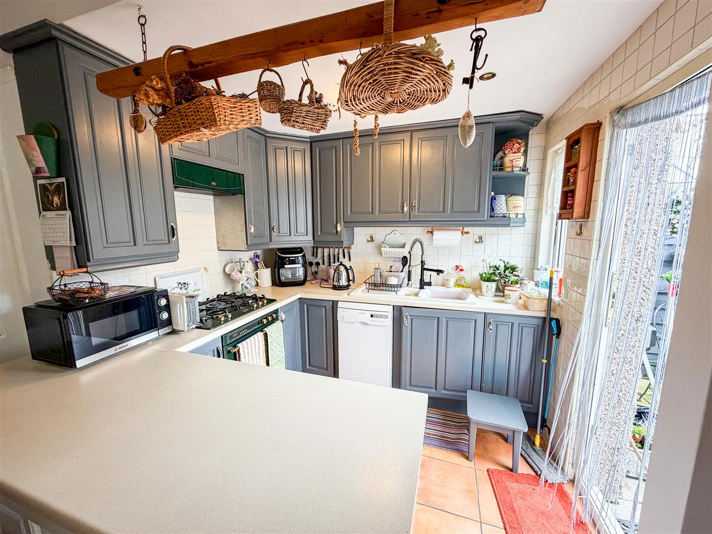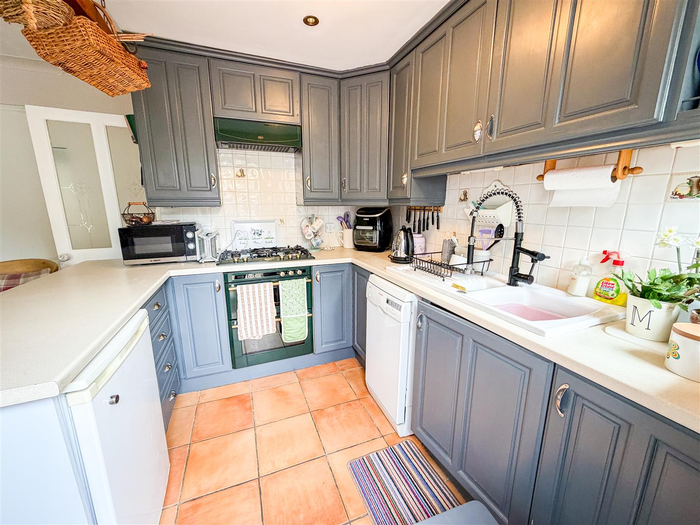 Fitted with a range of Grey wood panel fronted units comprises laminated rolled edge work surfaces with cupboards and drawers below. Range of matching wall mounted units. Inset one and a half bowl single drainer ceramic sink unit with mixer tap and additional pull out spray tap. Inset five ring gas hob with extractor hood above. Under counter double electric oven. (All appliances not tested). Space and plumbing for slimline dishwasher. Under counter fridge space. Tiled splashbacks. Tiled flooring. Double glazed window to rear.