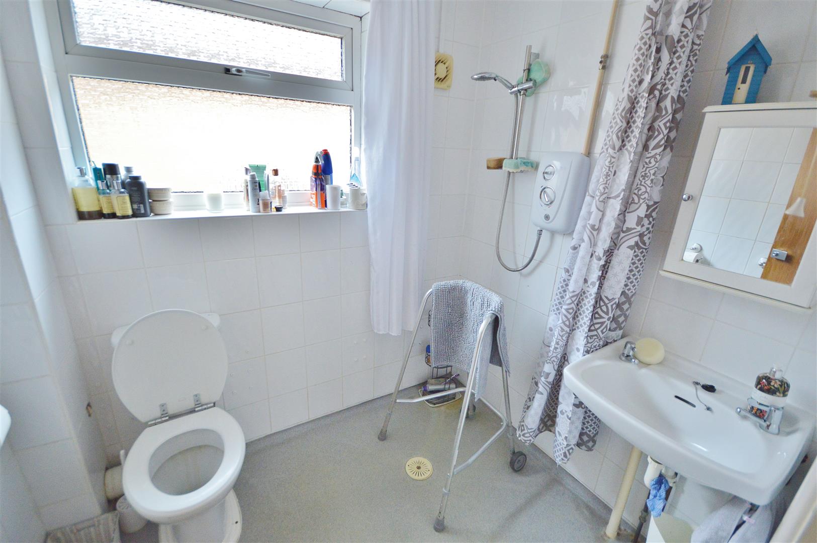 Comprises a low level W.C. Wall mounted hand wash sink basin. Wall mounted electric shower (not tested) with stainless steel shower head attachment connected above. Fully tiled. Radiator. Double glazed window to side.