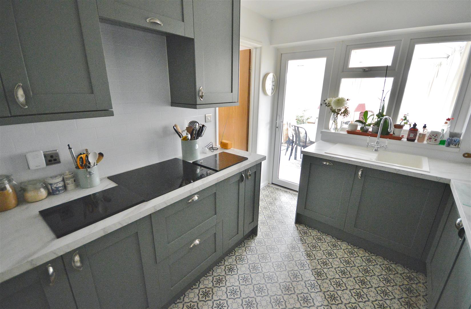 Fitted kitchen suite comprising laminated square edge work surfaces with inset single drainer sink unit stainless steel mixer tap. Integrated fridge freezer. Integrated dishwasher. Inset oven. Inset four ring electric hob with extractor hood above (not tested). Selection of matching wall units with cupboards and drawers at both eye and floor level. Radiator. Double glazed window to rear. UPVC Double glazed door leading to: