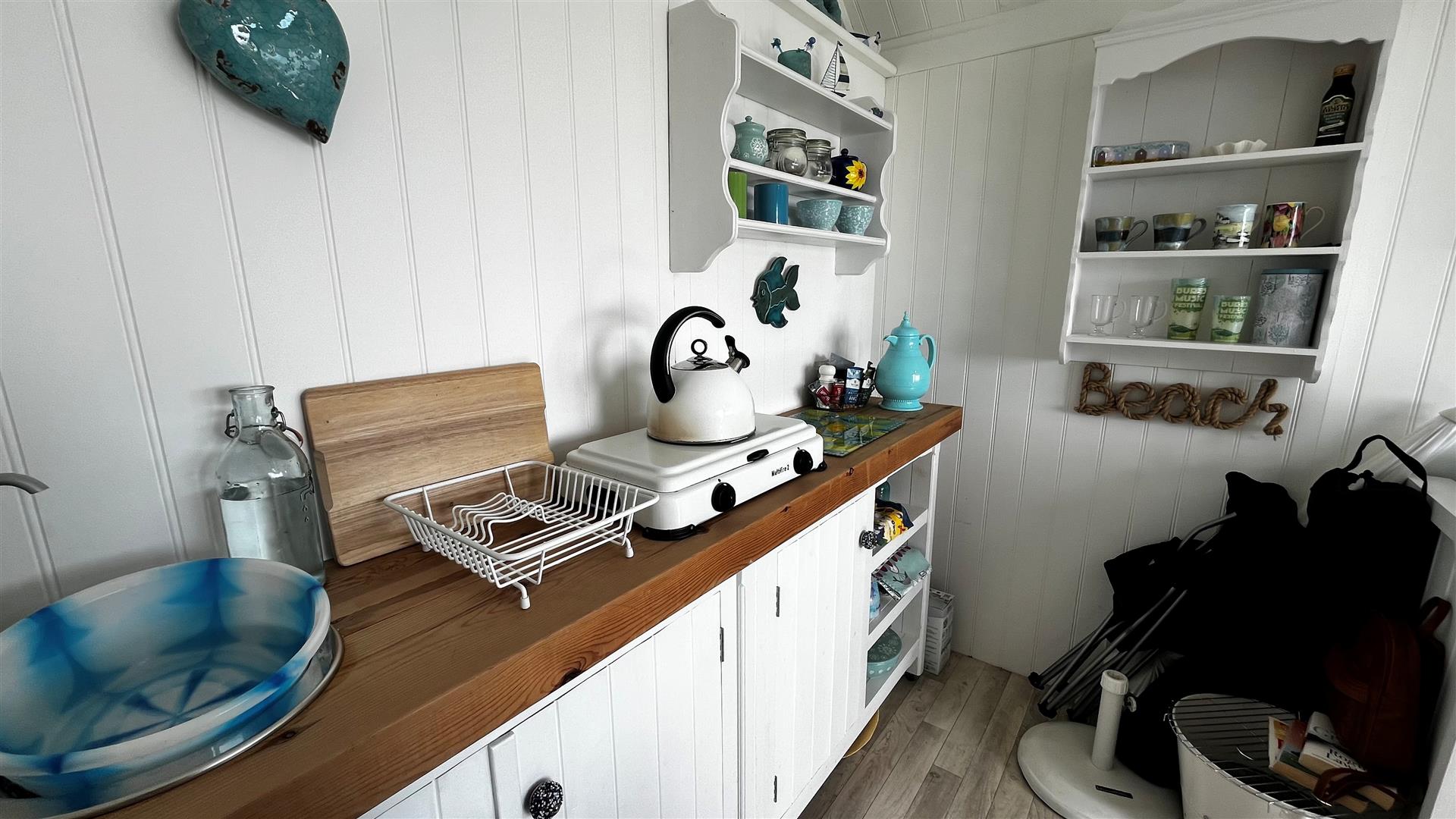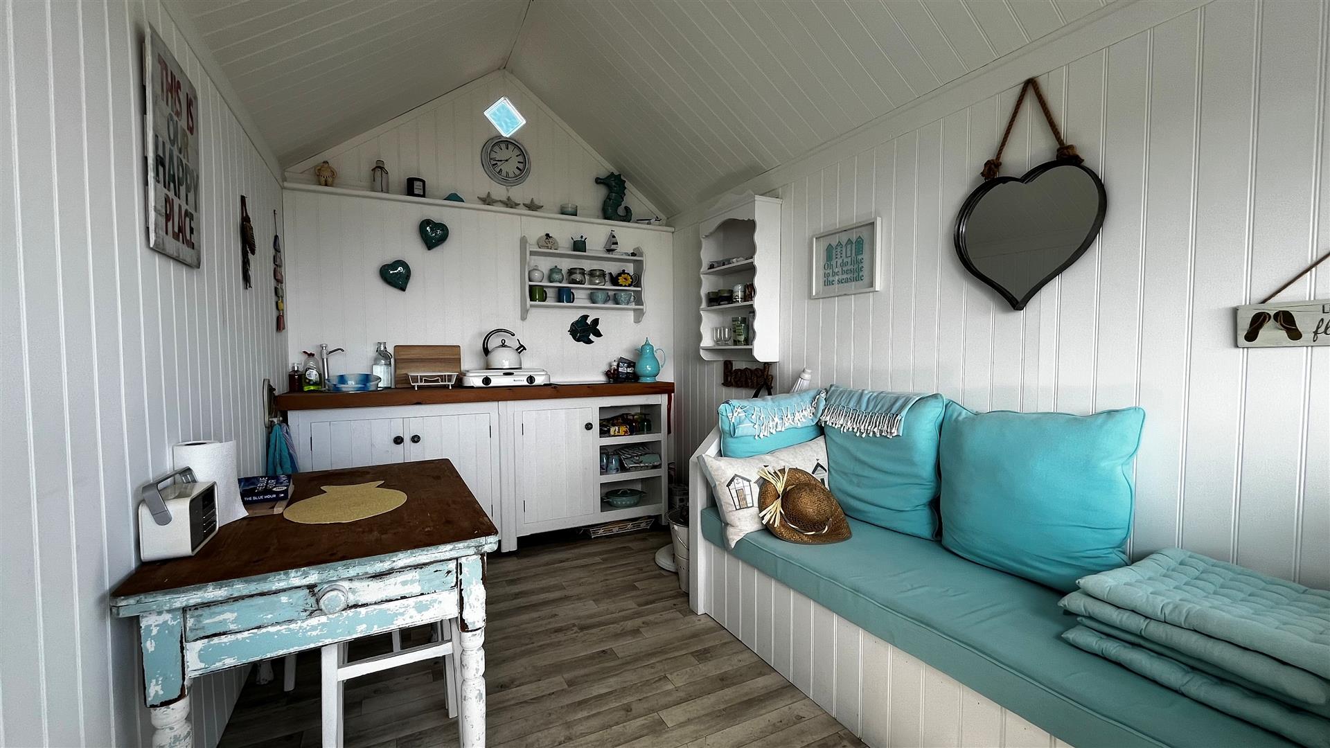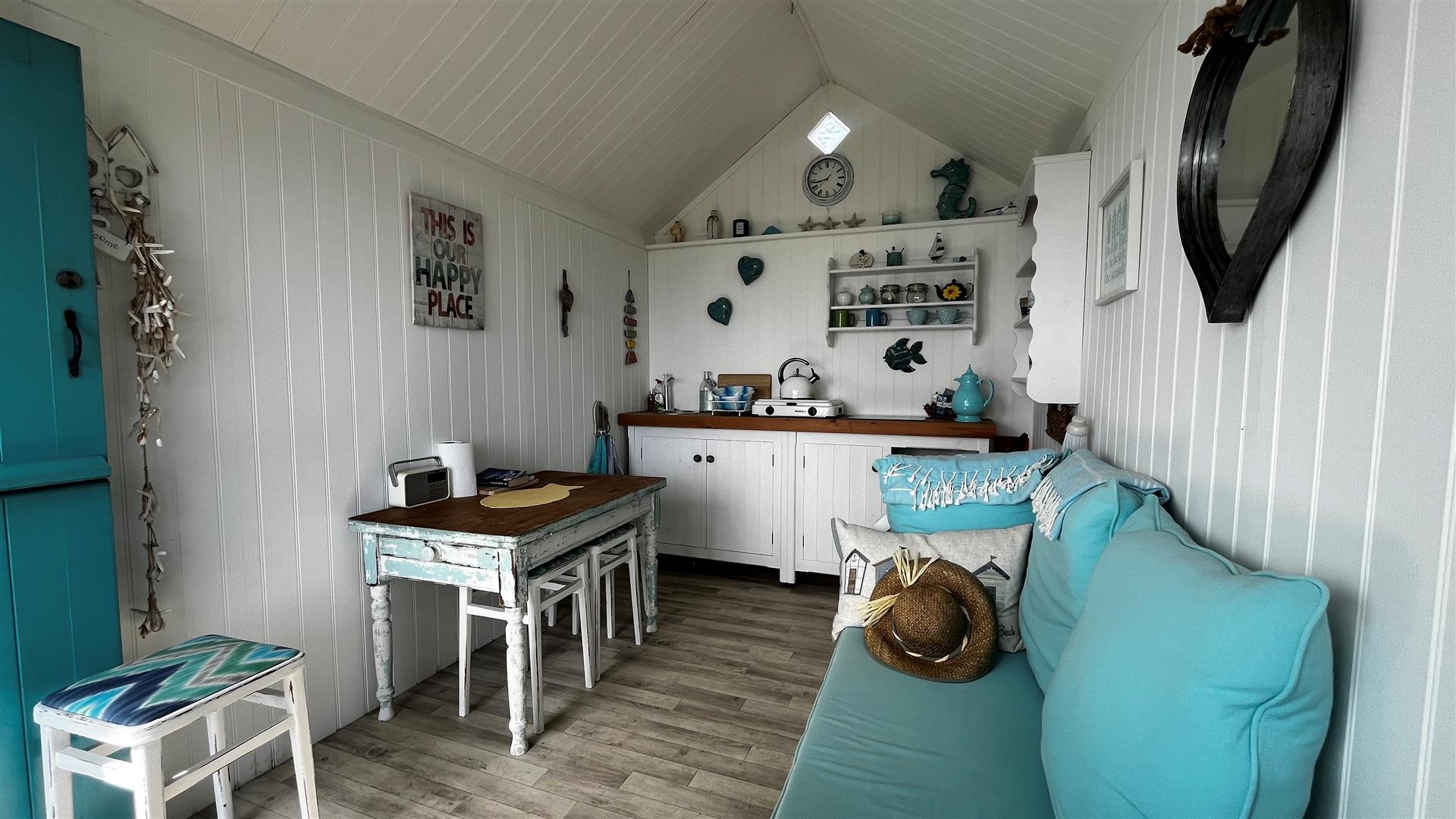 Storm door. Stable door. Window hatch with elevated sea views. Overhead storage. Bench seating with storage under. Modern kitchen unit with square edge worksurface and storage under. Inset stainless steel circular sink bowl. Fitted shelving. Freestanding table and chairs. Assortment of kitchen and beach equipment to remain.