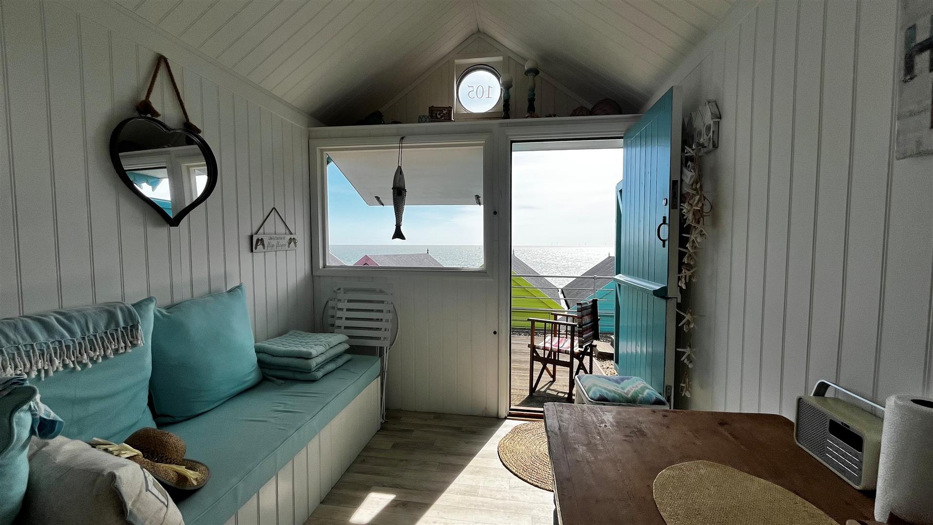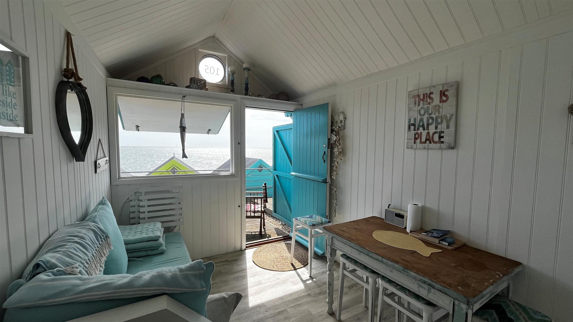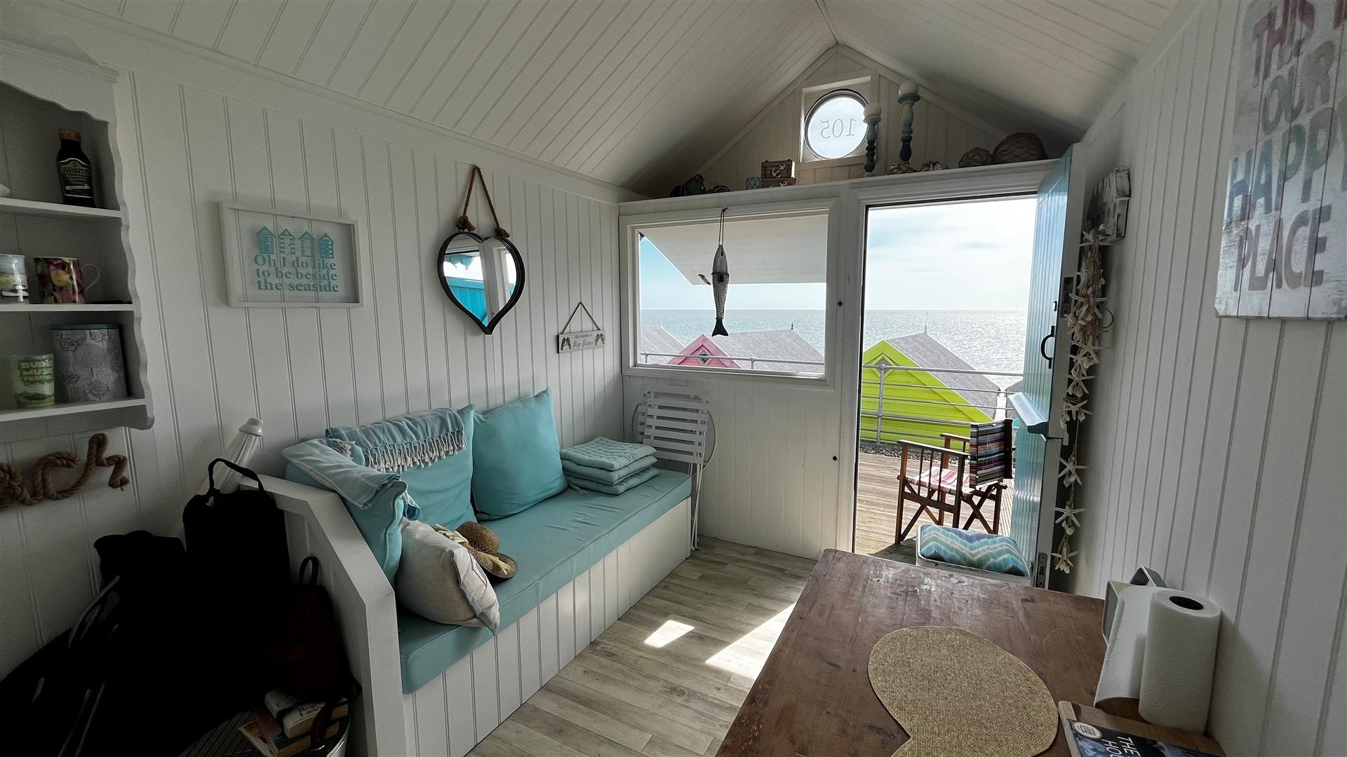 Storm door. Stable door. Window hatch with elevated sea views. Overhead storage. Bench seating with storage under. Modern kitchen unit with square edge worksurface and storage under. Inset stainless steel circular sink bowl. Fitted shelving. Freestanding table and chairs. Assortment of kitchen and beach equipment to remain.