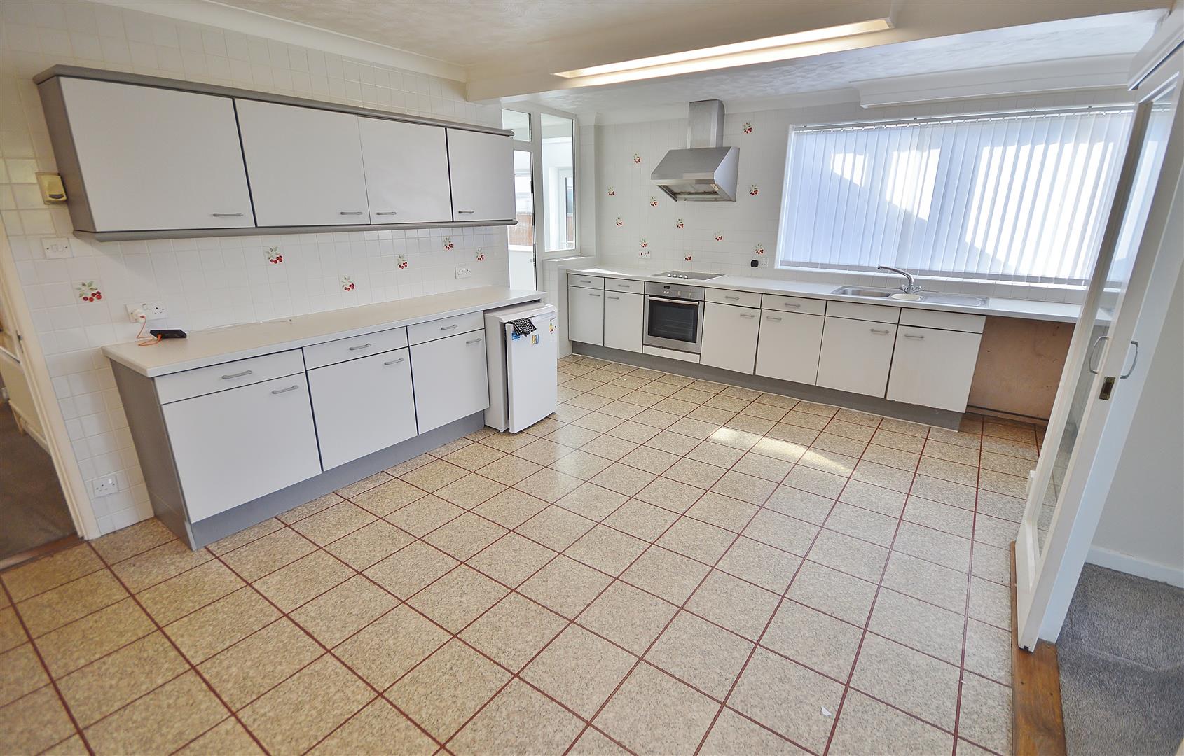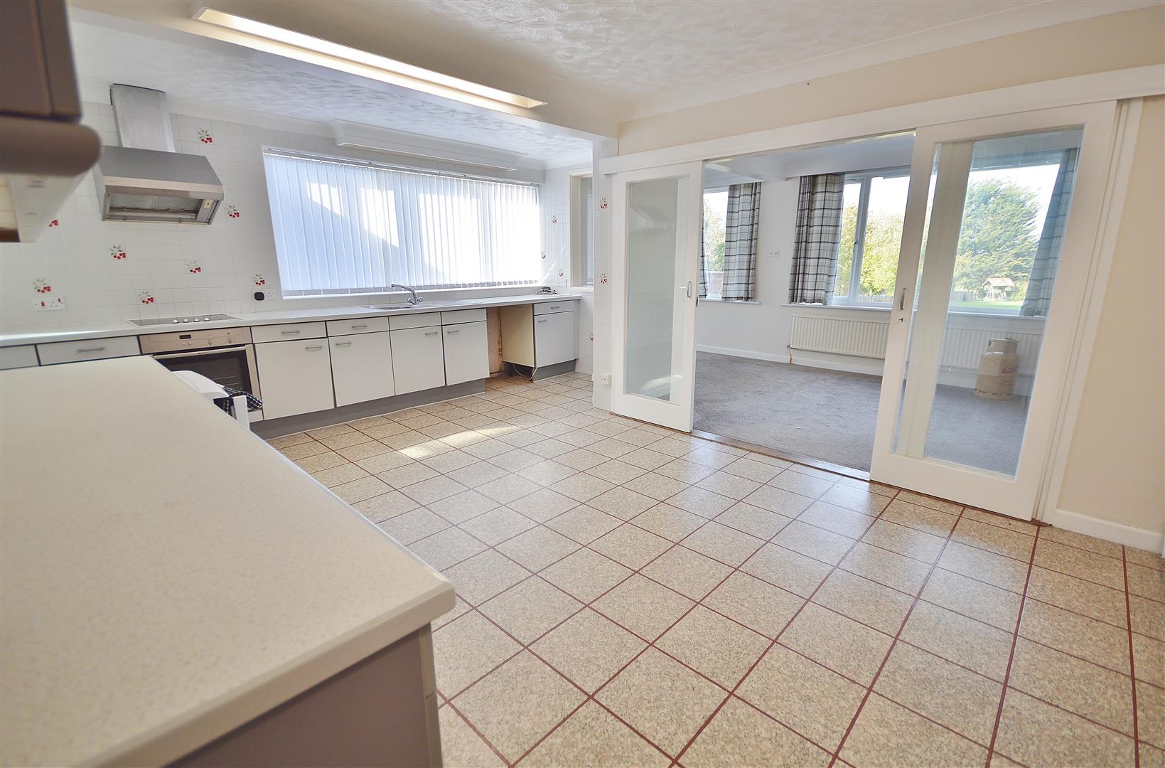Comprises laminated rolled edge work surfaces with inset one and a half bowl stainless steel single drainer sink unit. Inset four ring electric hob with oven under and extractor hood over (all appliances not tested). Plumbing and space for washing machine and under counter fridge or freezer. Selection of matching units at both eye and floor level. Two radiators. Windows to both side and rear aspects. Sliding doors leading to lounge. Further door leading to lobby.