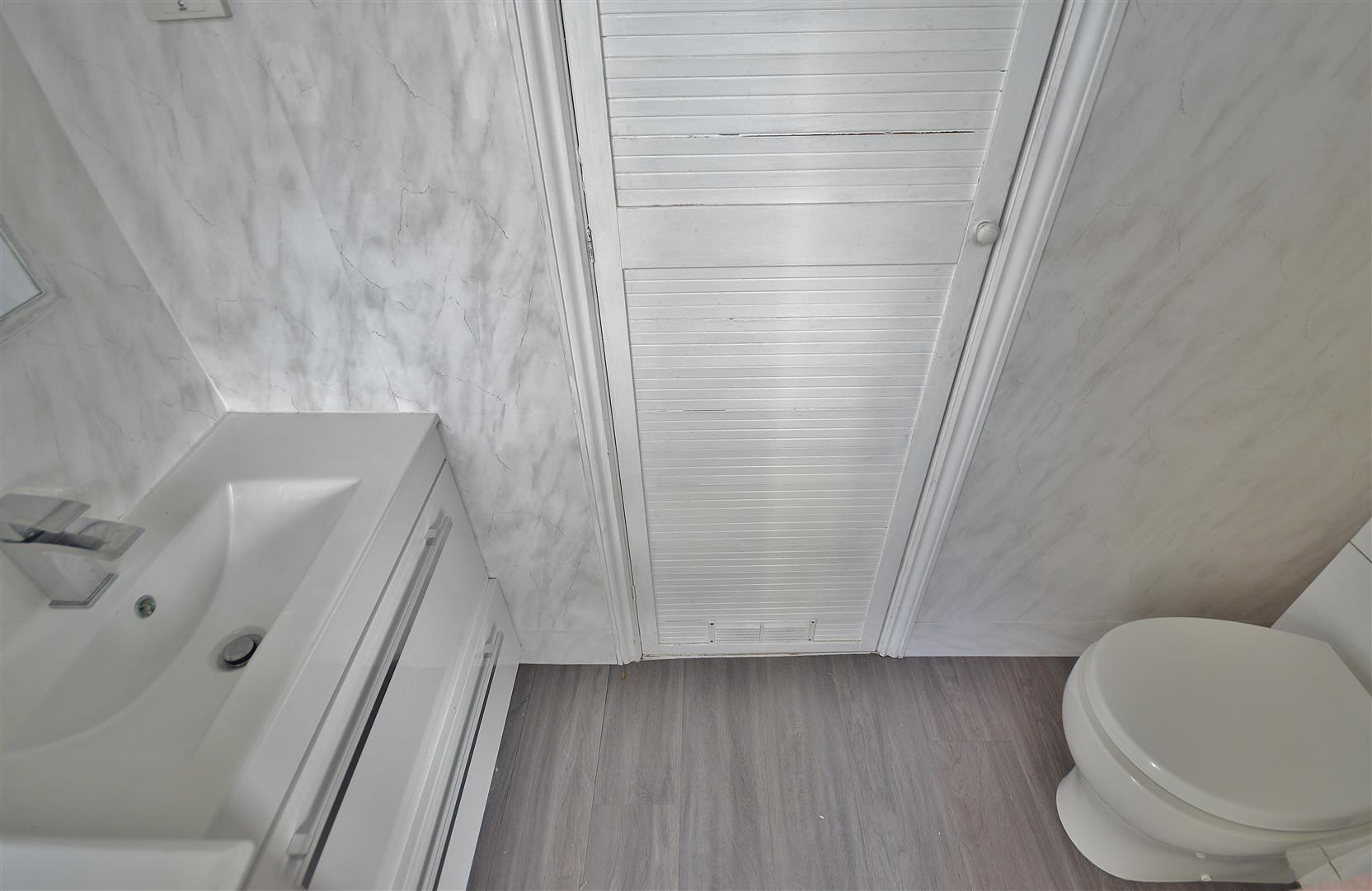 Comprises of a low level W.C. Vanity hand wash basin with drawers under. Storage cupboard housing floor standing oil boiler (not tested).
