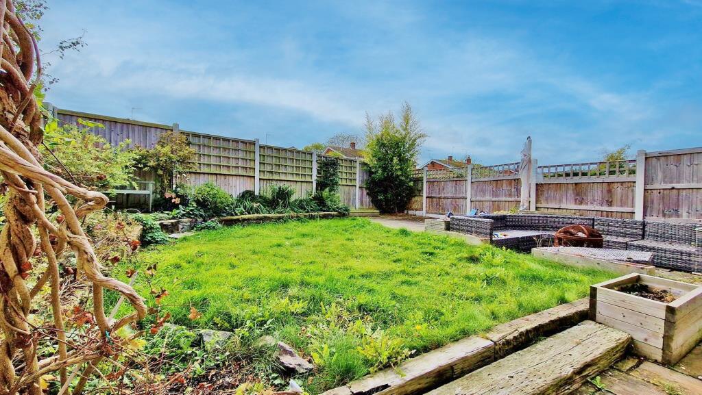 Timber constructed bin store to remain. Part laid to lawn. Borders stocked with shrubs and bushes. Plum tree. Hawthorn tree. Hardstanding area providing off street parking.