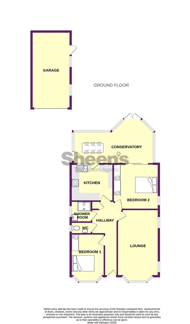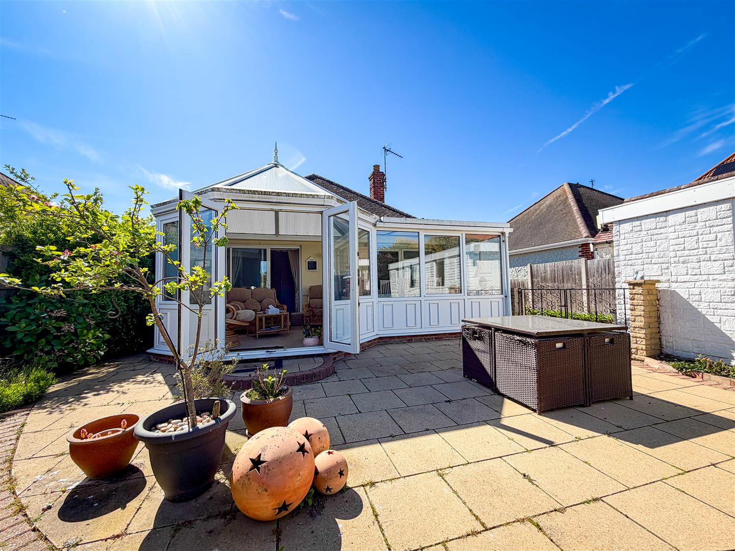 The property features two generously sized double bedrooms, along with a modern fitted kitchen and a contemporary shower room complemented by a separate W.C. Additional benefits include gas central heating and double glazing throughout. A standout feature of the home is the impressive 21’2 (max) ‘P’-shaped conservatory, providing a versatile living space with views over the beautifully maintained 58′ x 40′ rear garden.