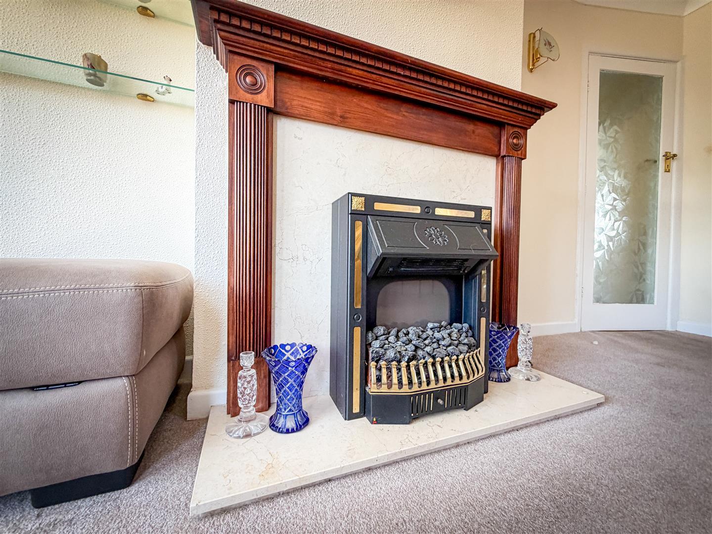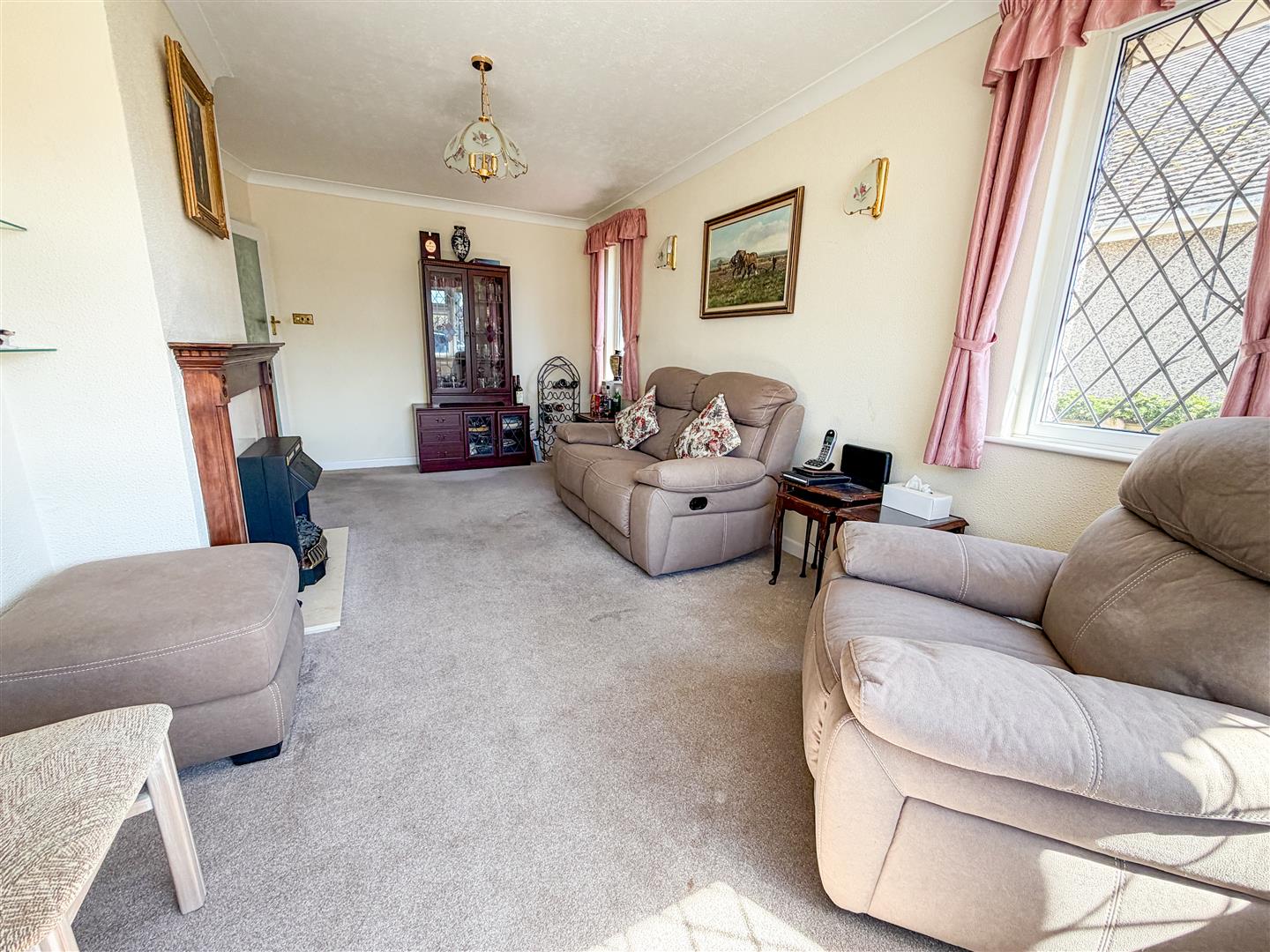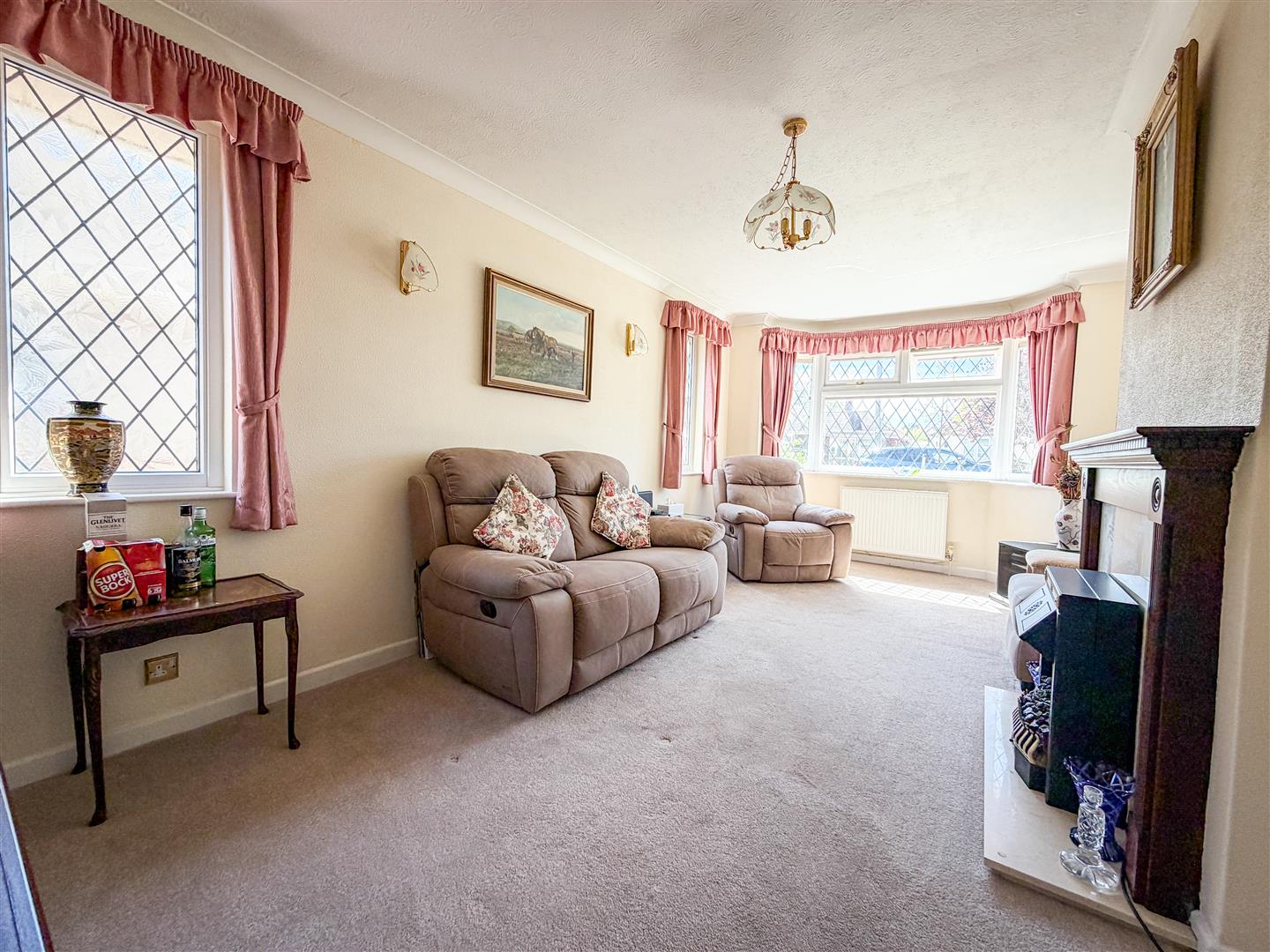 Radiator. Feature fireplace with inset electric fire (not tested). Double glazed leaded light effect bay window to front with distant partial sea views across road. Additional two leaded light effect double glazed windows to side.