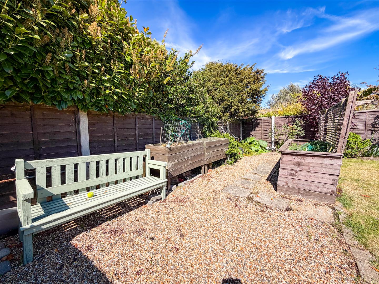 Approx 58' x 40' landscaped rear garden. Mainly laid to lawn with array of flower and shrub borders. Curve paved patio area. Shingled area with raised vegetable garden planters. Enclosed by panel fencing.