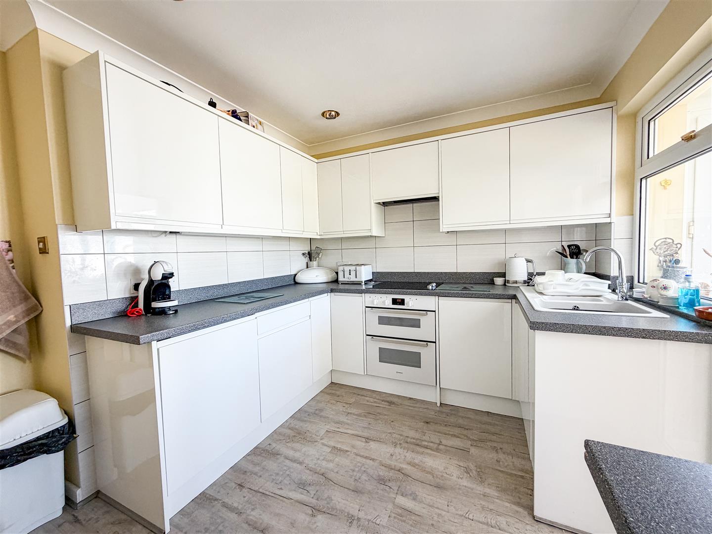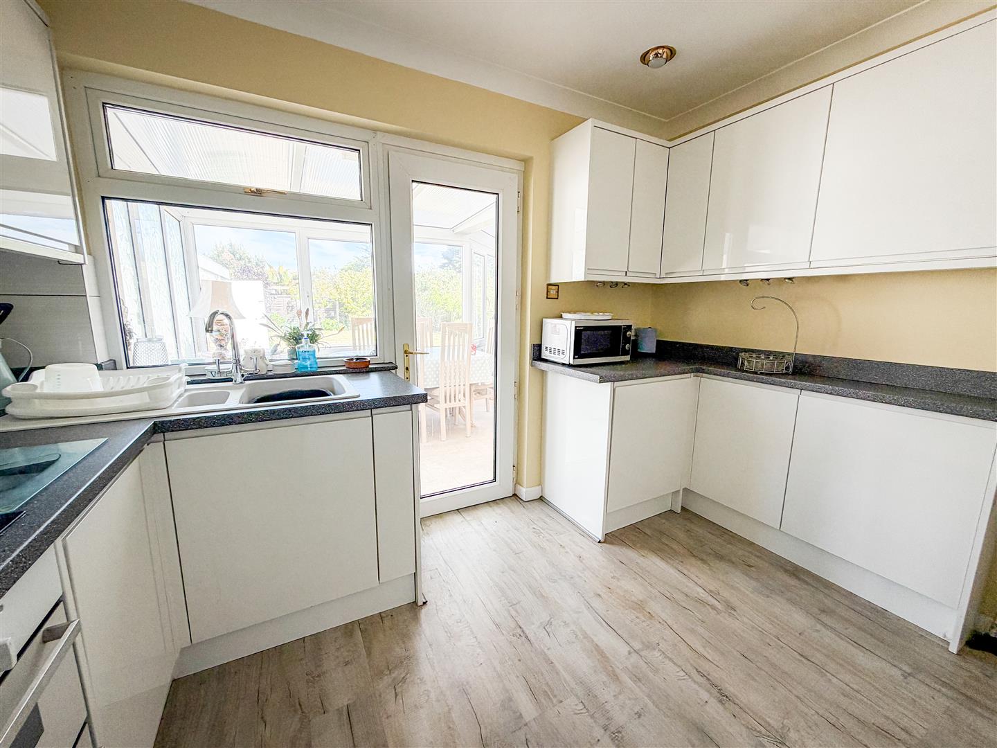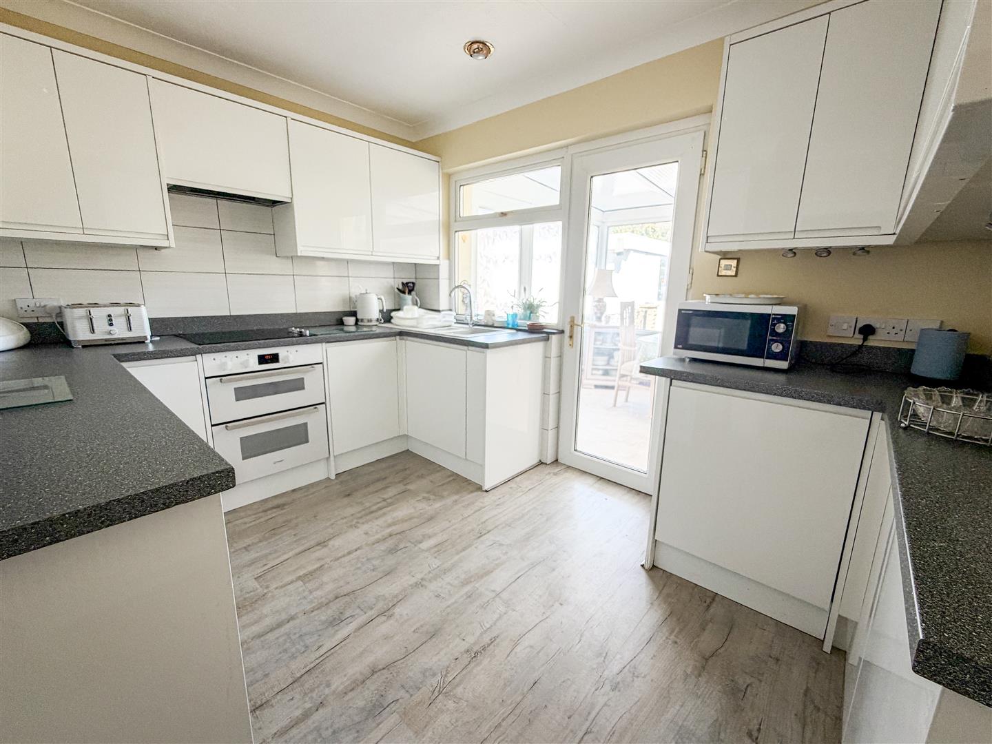 Fitted with a modern kitchen suite. Comprises white gloss fronted units. Granite effect laminated rolled edge work surfaces with cupboards and drawers below. Range of matching wall mounted units. Inset one and a half bowl single drainer stink unit with mixer tap. Inset four ring ceramic electric hob with integrated extractor hood above. Under counter double electric oven. Integrated under counter fridge Integrated under counter washing machine and Integrated Dishwasher. Radiator. Wood effect flooring. Double glazed window to rear and further double glazed door to Conservatory.