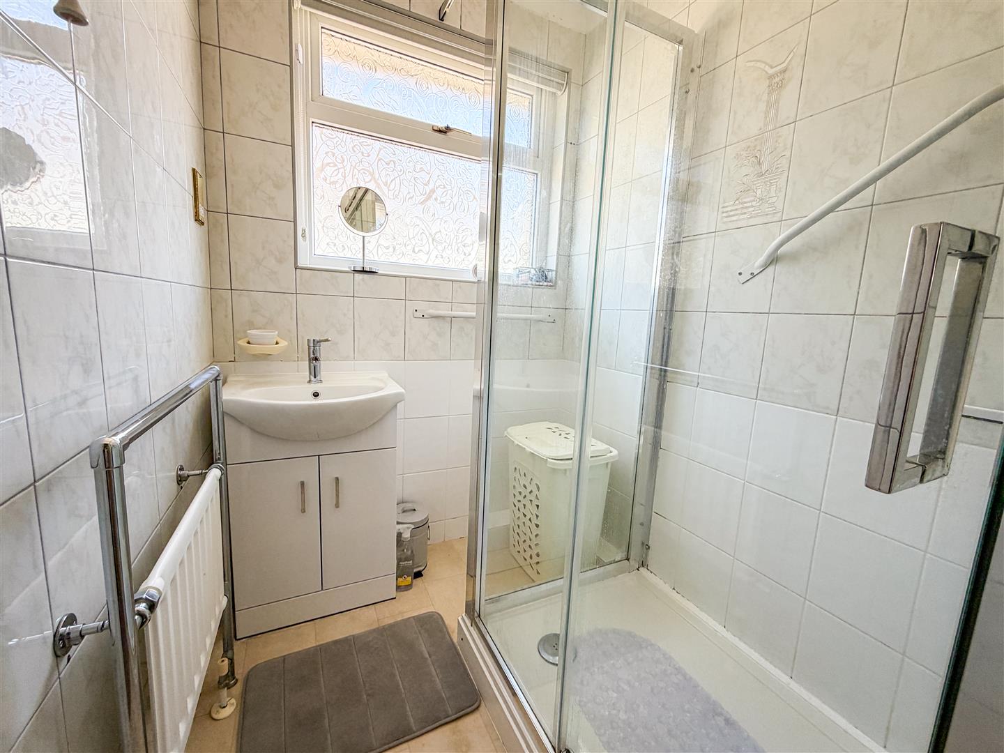 Fitted within modern white suite. Comprises independent shower cubicle with wall mounted shower. Vanity wash hand basin with cupboards below. Fully tiled walls. Heated towel radiator. Double glazed window to side.