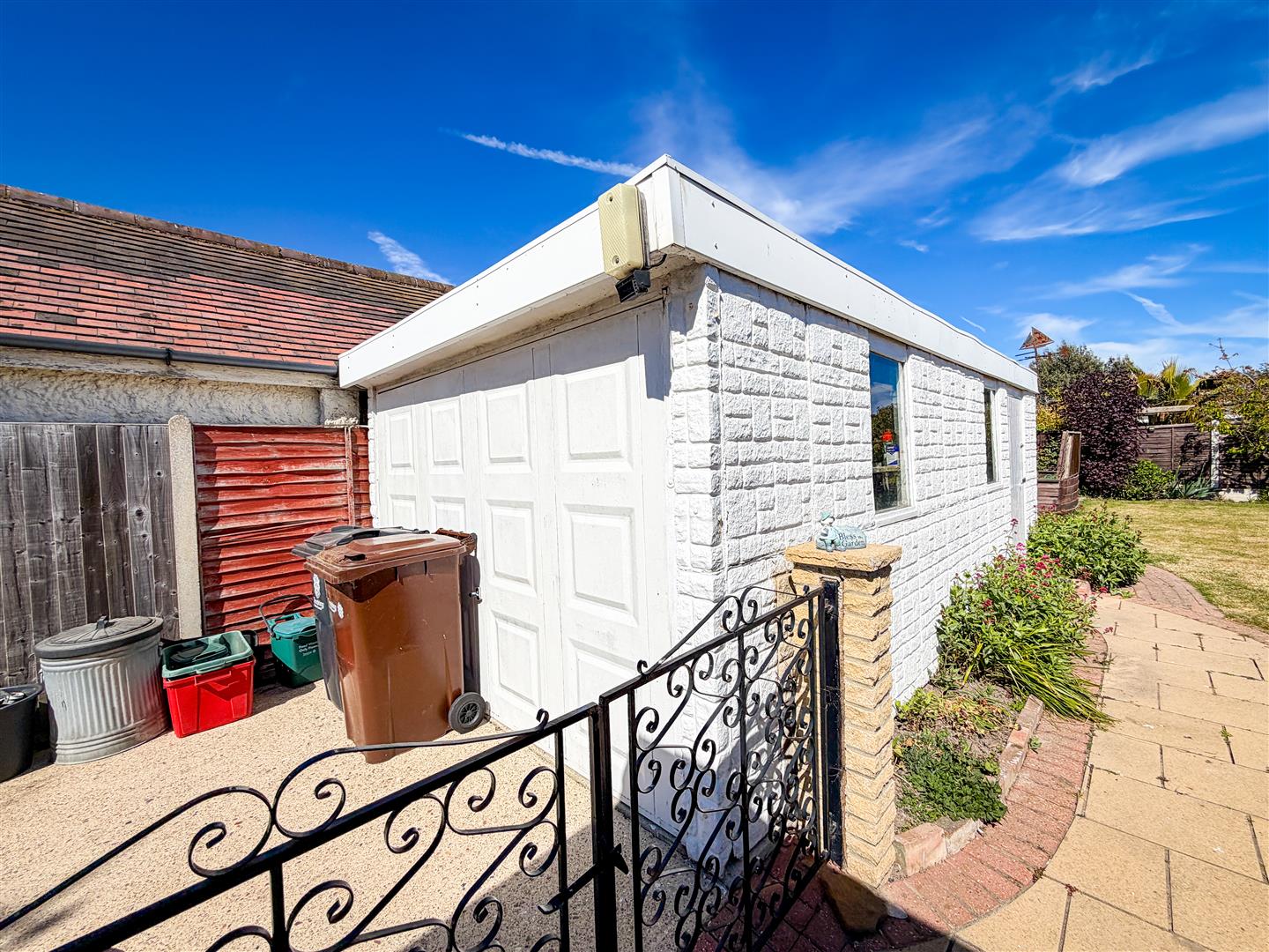 Up and over door, Power and light connected. Personal door from garden.