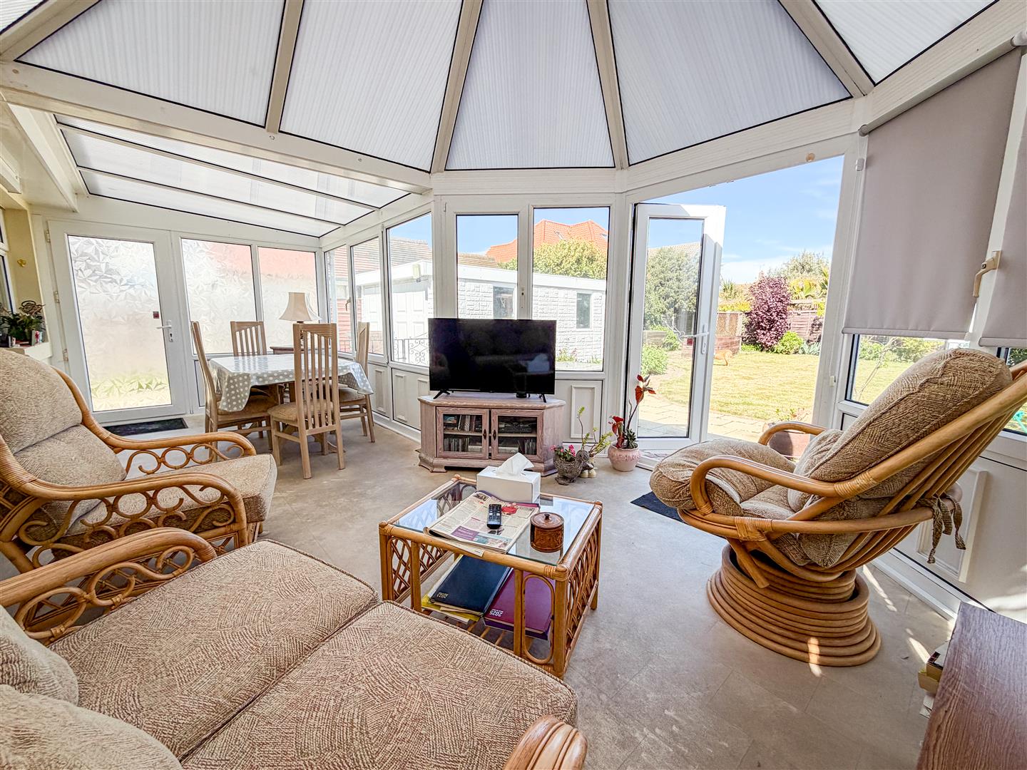 'P' shaped conservatory. Double glazed windows to sides and rear overlooking rear garden. Vaulted poly-carbonate roof. Radiator. Double glazed door to side. Double glazed double doors to rear garden.