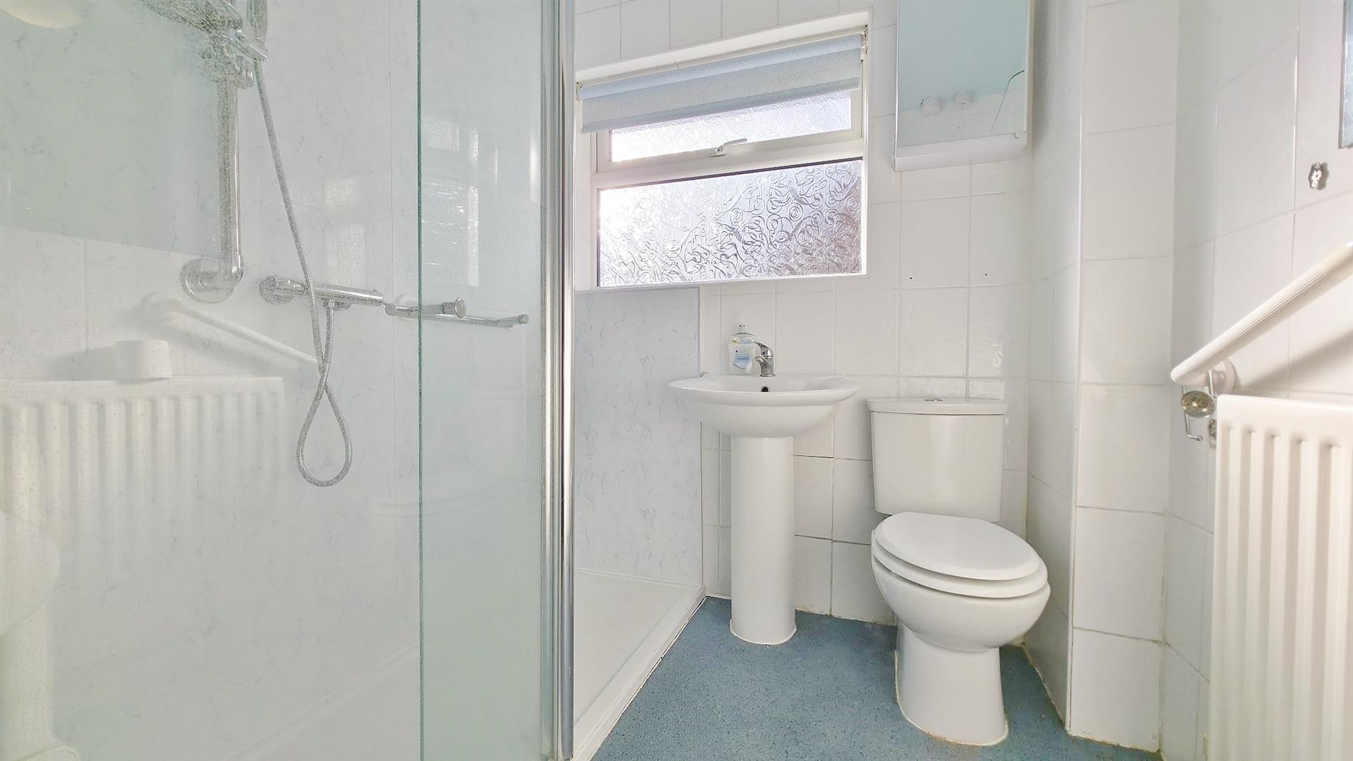 White suite comprises of low level WC. Pedestal wash hand basin with mixer tap. Fitted shower cubicle with wall mounted shower attachment. Weatherboard splashback. Remainder tiled walls. Vinyl flooring. Extractor fan. Radiator. Obscured sealed unit double glazed window to side.